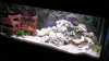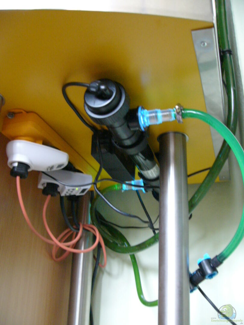Das Becken hat eine Glasstärke von 12 mm mit gebogener Frontscheibe. der Unterschrank, Blenden und der Beleuchtungsbalken sind von einem Schlosser in Edelstahl angefertigt worden. In den Beleuchtungsbalken ist noch ein 3 D Karoedelstahlreflektor über der gesamten Fläche. Rückwand ist ein Eigenbau aus Stroypor, 2K Schaum, Zement, Dispersionsfarbe, Klarlack. Stärke 5 - 10 cm. Sowie die rechte Aquariumseite auch aus einer selbstgebauten Wand, für die Technik, mit Ein u. Auslasslöchern besteht.