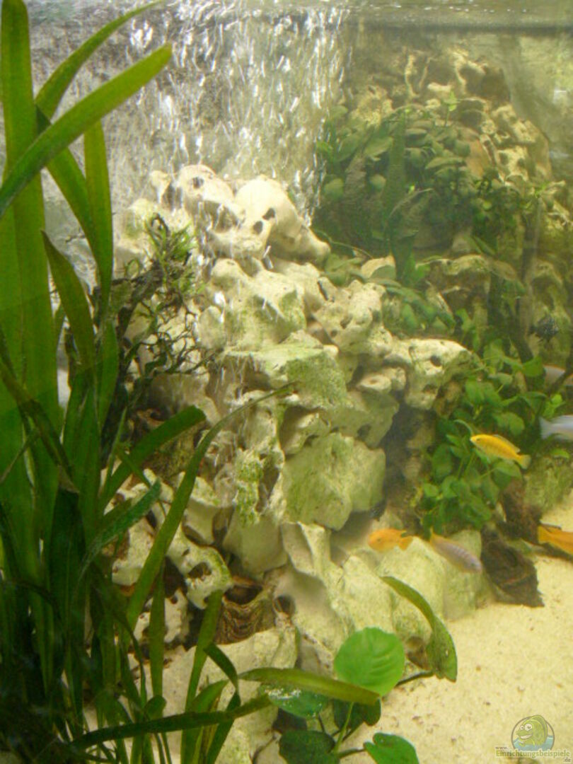 Steine 150 Kg. Als Grundgestell Kalksandsteine aus dem Baumarkt Stück 0, 30 ???, und mit Wei??en Lochsteinen verkleidet. Dadurch sind viele Höhlen entstanden u. die Fische können teilweise hinter den Steinenaufbauten Schwimmen.