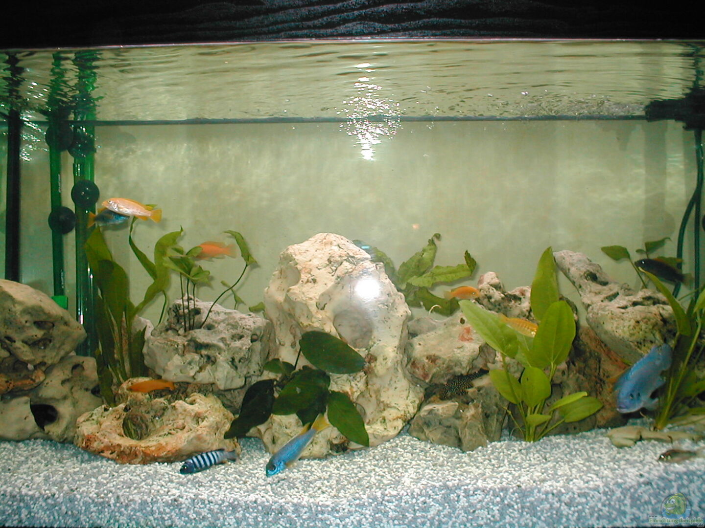 Zu deinem Becken, die Einrichtung bringt viele versteckplätze das ist besonderst für deine Mbunas geignet. Zum Boden, Kies würde ich nicht empfählen, sondern Sand am besten Quarzsand das entspricht echer den natührlichen lebensraum der Fische.