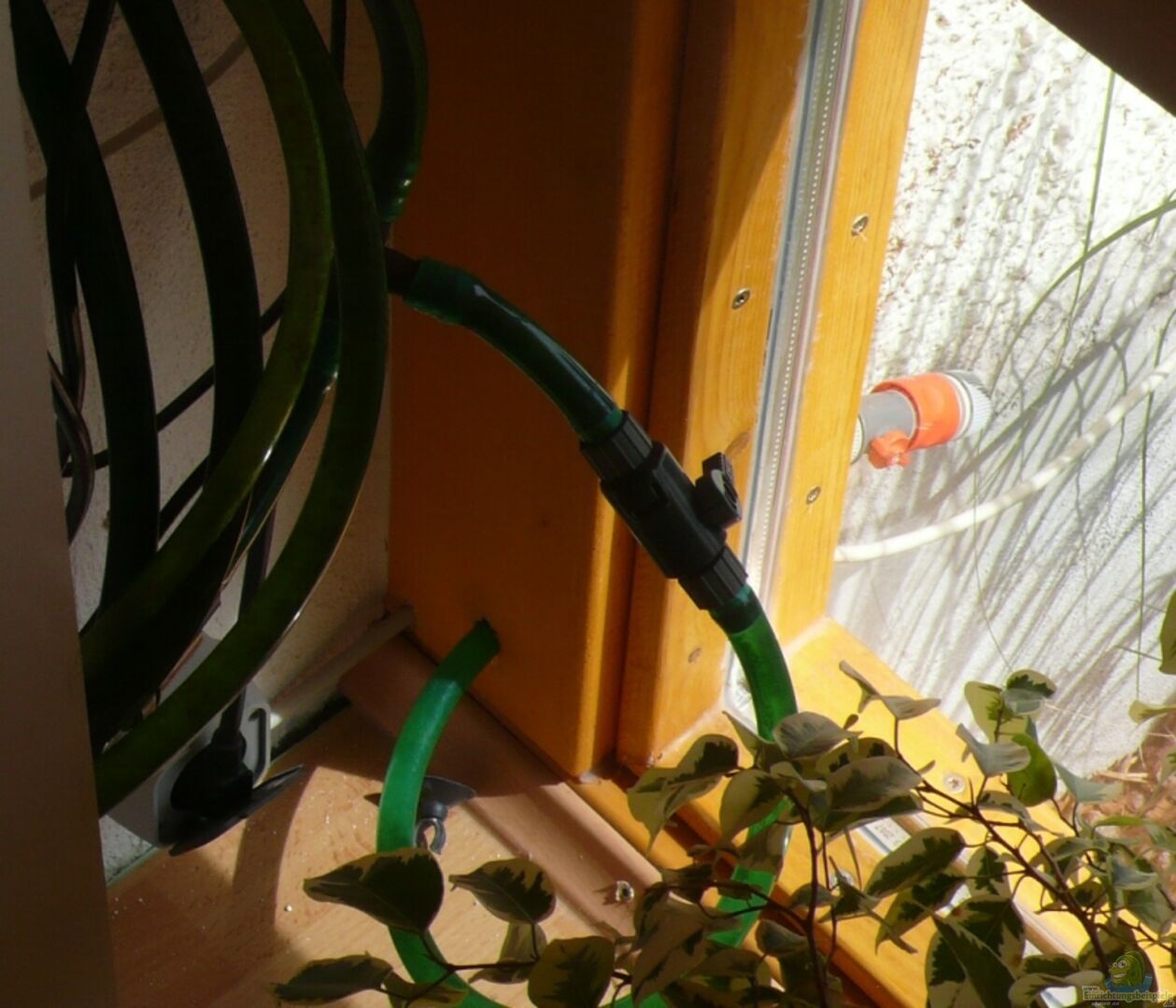 die Schlauchanschlüsse der einen Eheimpumpe wurden mit Hähnen und abzweigen so gebaut das ich beim wasserwechsel nur drau??en im Garten per Gardenaschnellverschlu?? ansschlie??e und so be.-und entwässerung ganz leicht ohne ´sauerei´vornehmen kann.