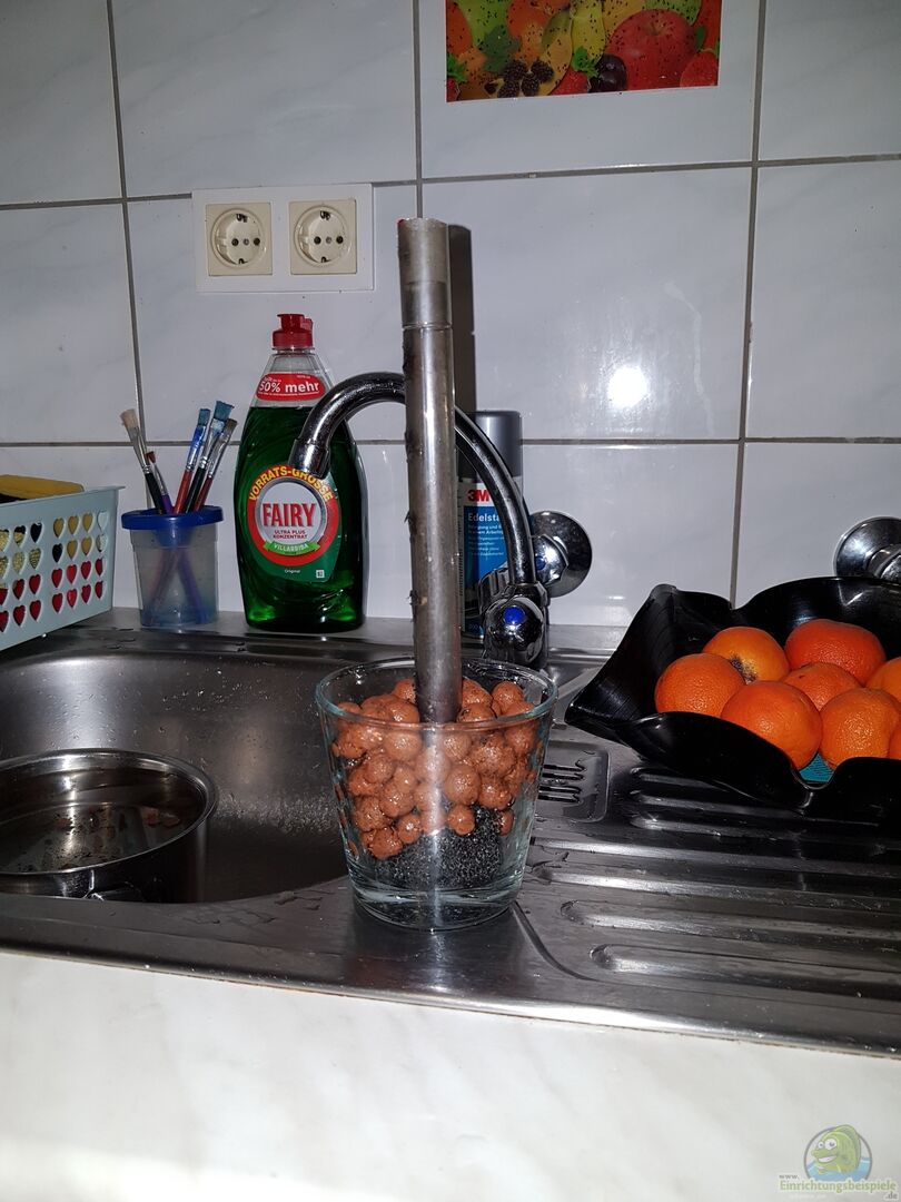 Ein Trinkglas genommen, dort eine Schaumstoff Filterpatrone genommen. So das es gut anliegt am Glas ohne Grösse Lücken.