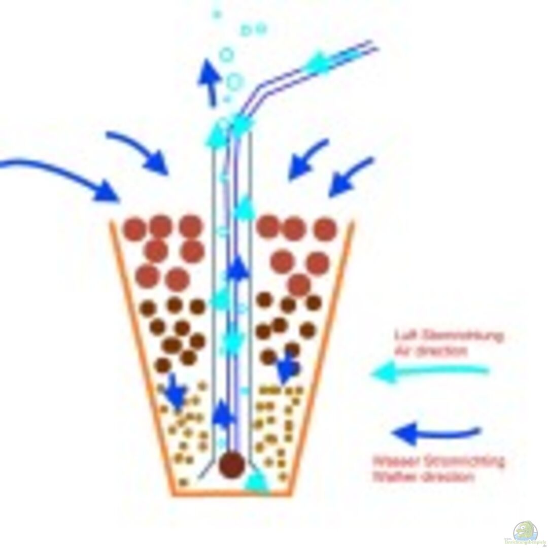 Ist der Topf bis zur Oberkante mit dem Gewucherten Filtermaterial gefüllt steckt man den Ausströmstein auf den Luftschlauch und führt ihn bis zum Topfboden in das Rohr ein, jetzt können wir den Filter im Becken platzieren, zum Testen des Luftstromes ist es gut wenn das Rohr etwas über die Wasseroberfläche ragt, nun stellen wir den Luftstrom so ein das stetig Wasser nach oben gehoben wird ohne das zu gro??e Blasen entstehen, ein Topffilter sollte möglichst mittig im Becken platziert werden, ein Topffilter ist fast wartungsfrei, nur wenn sich der Durchfluss deutlich verringert muss das Filtermaterial, meist nur die oberen Lagen, gewechselt werden, bzw. die Schwämme ausgedrückt ( wohlgemerkt ausgedrückt, nicht etwas ausgewaschen oder gar gespült) werden. Allerdings könne bis dahin durchaus 1-2 Jahre vergehen.