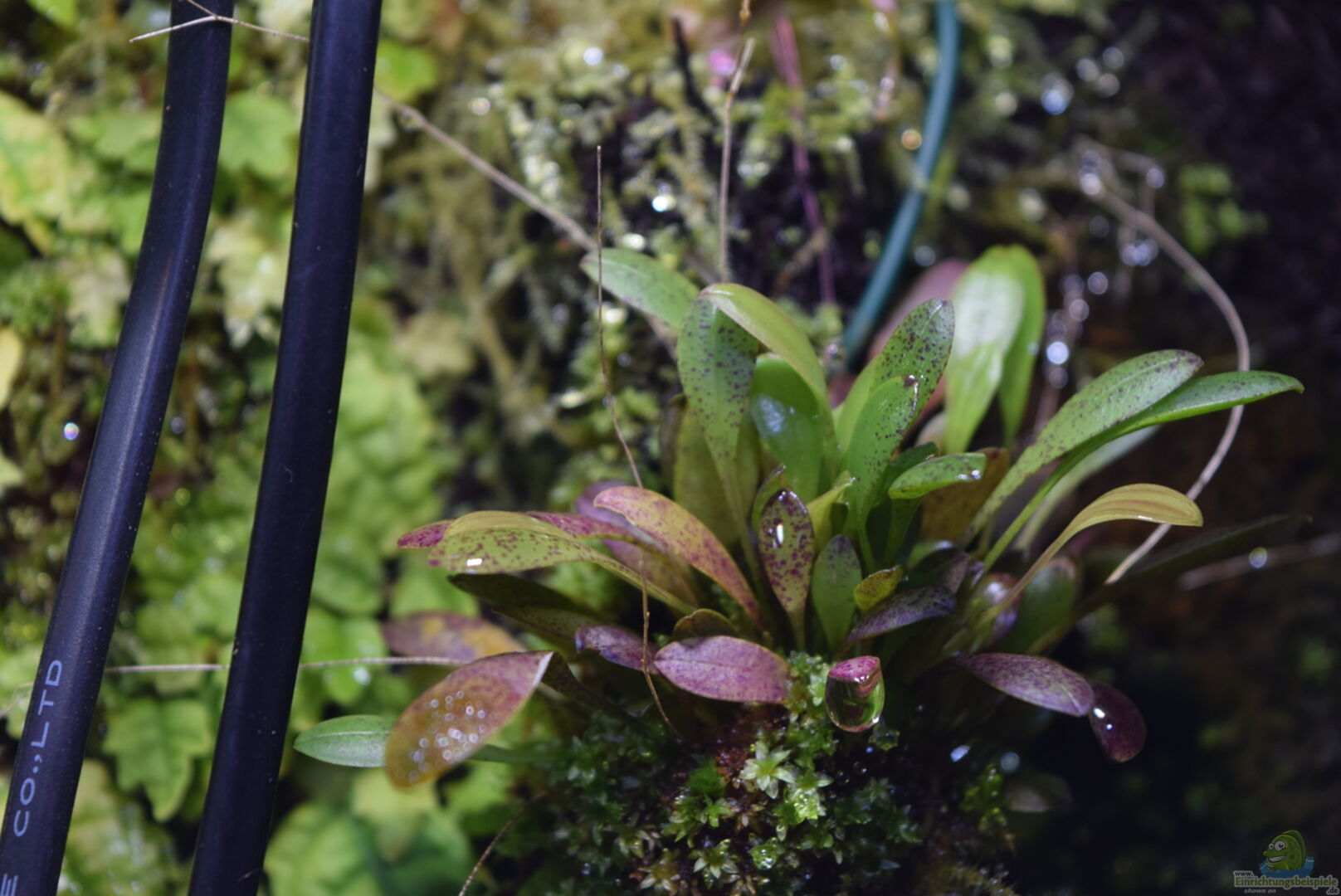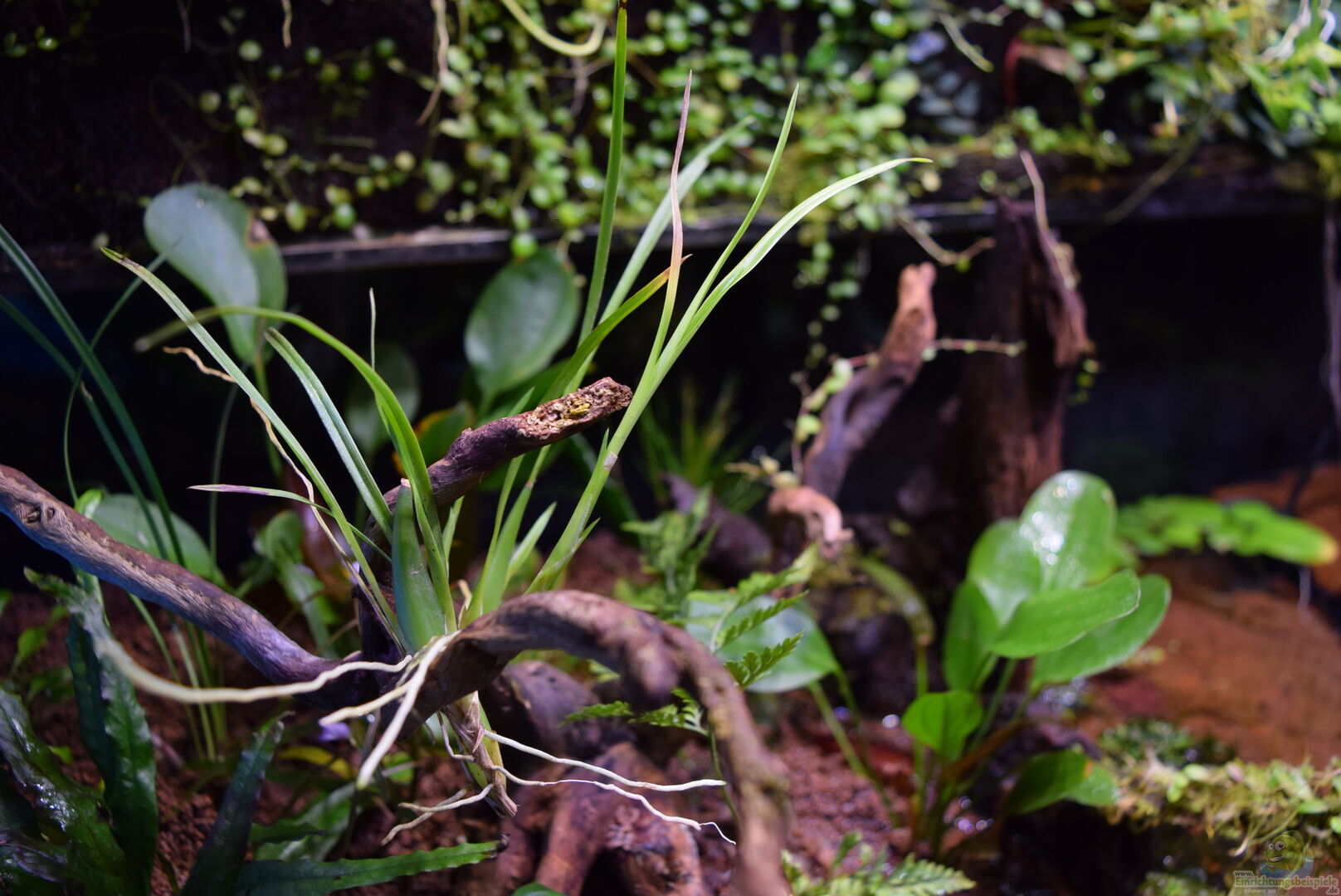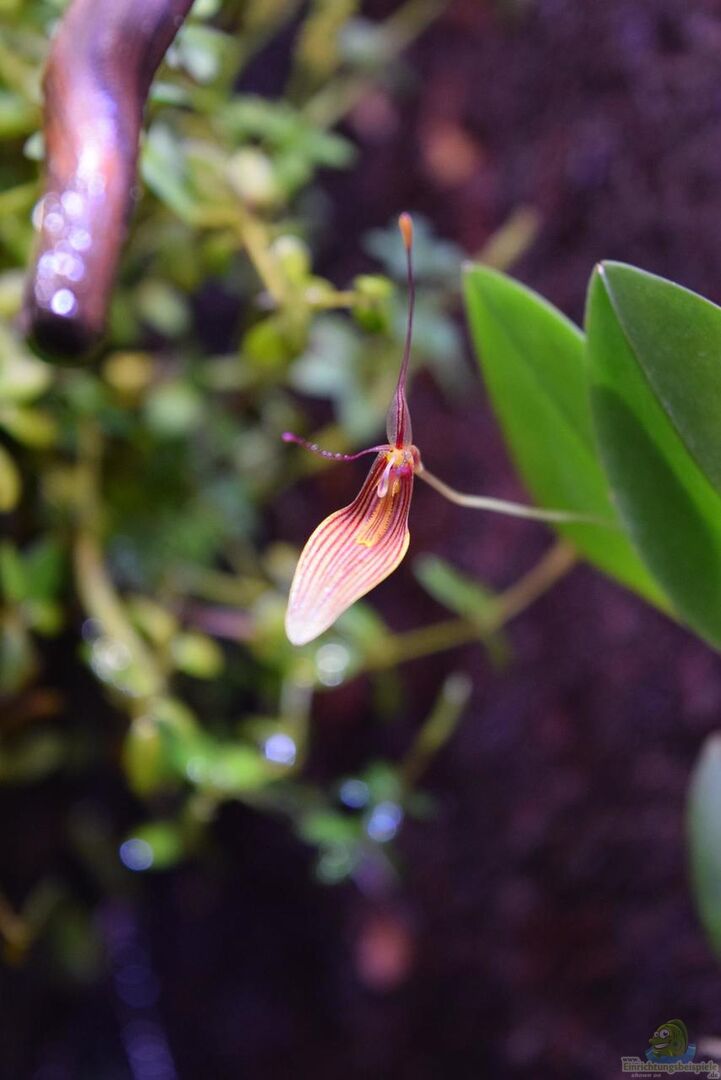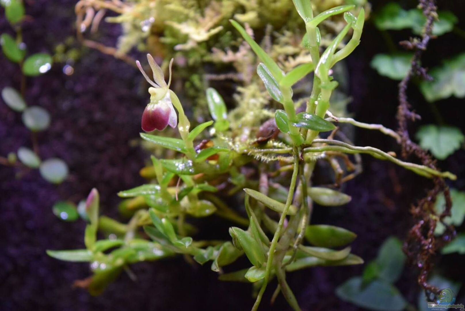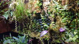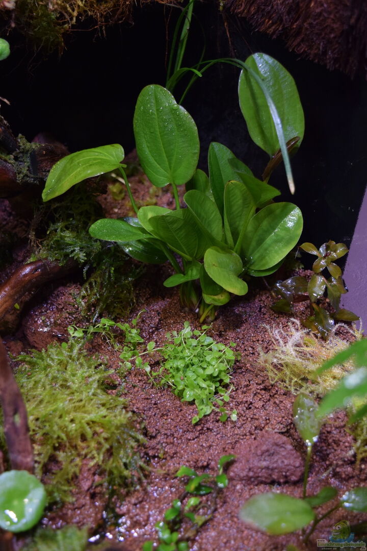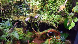 Neoregelia green pointet, Neoregelia schultesiana purple red, Epidendrum Porpax, Dischidia hirsuta, Microgramma reptans, Peperomia rostrata, Epidendrum cochleatum, , Gomesa radicans, Dendrobium wassellii, Barbosella cogniauxiana, Sphagnum-Moos, Ficus quercifolia, Hygrophila "Siamensis 53B", Microsorum pteropus 'Narrow' , Echinodorus schlueteri Leopard , Juncus Repens , Alternanthera reineckii "Rosaefolia", Restrepia trichoglossa, Stelis sp., Peperomia hoffmanii