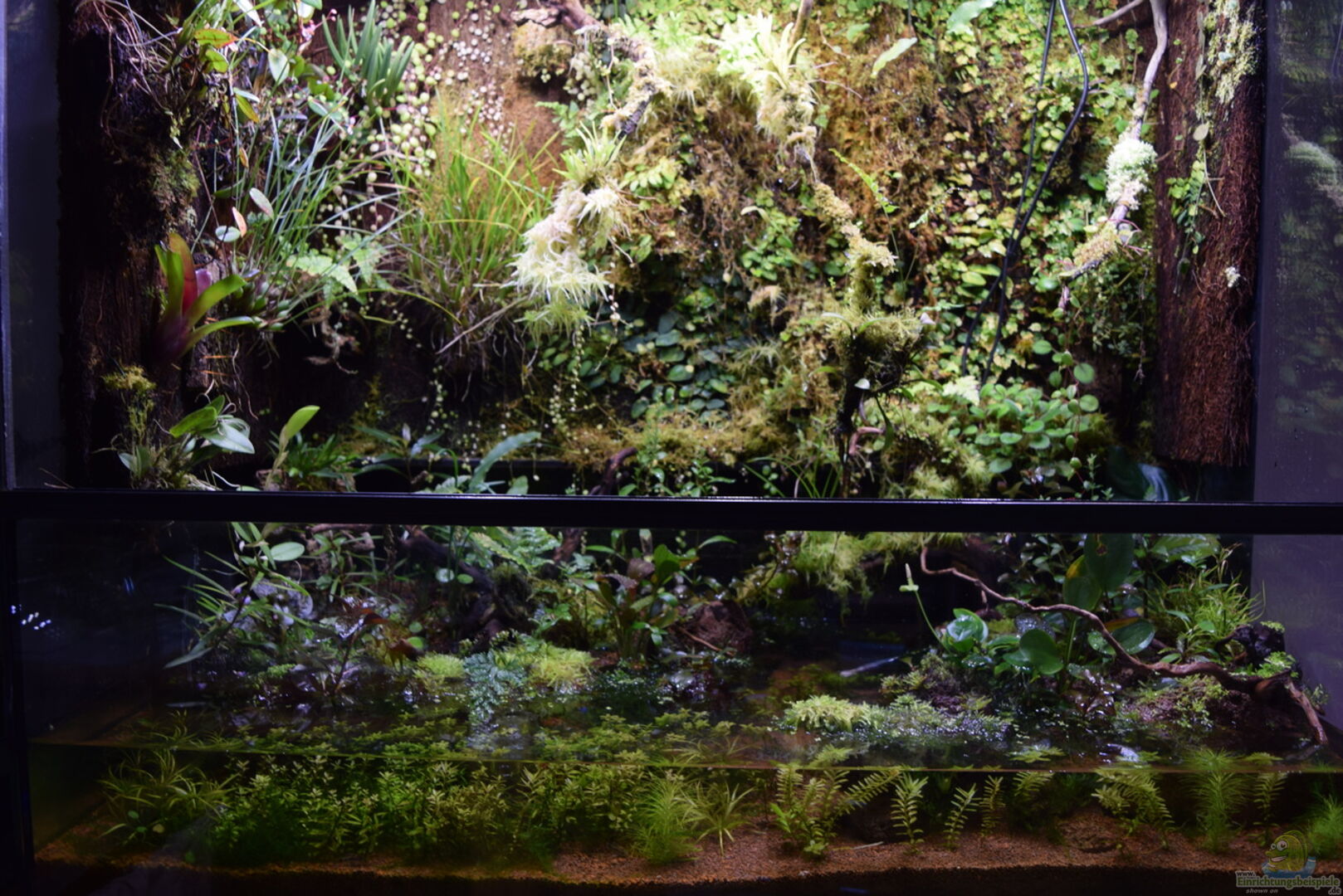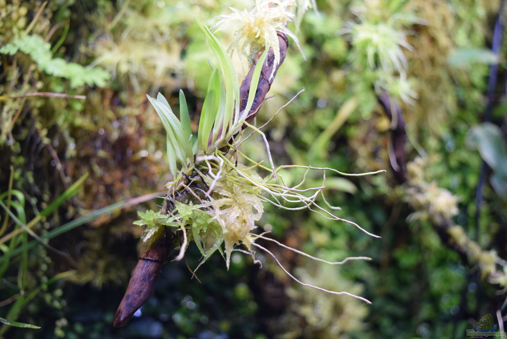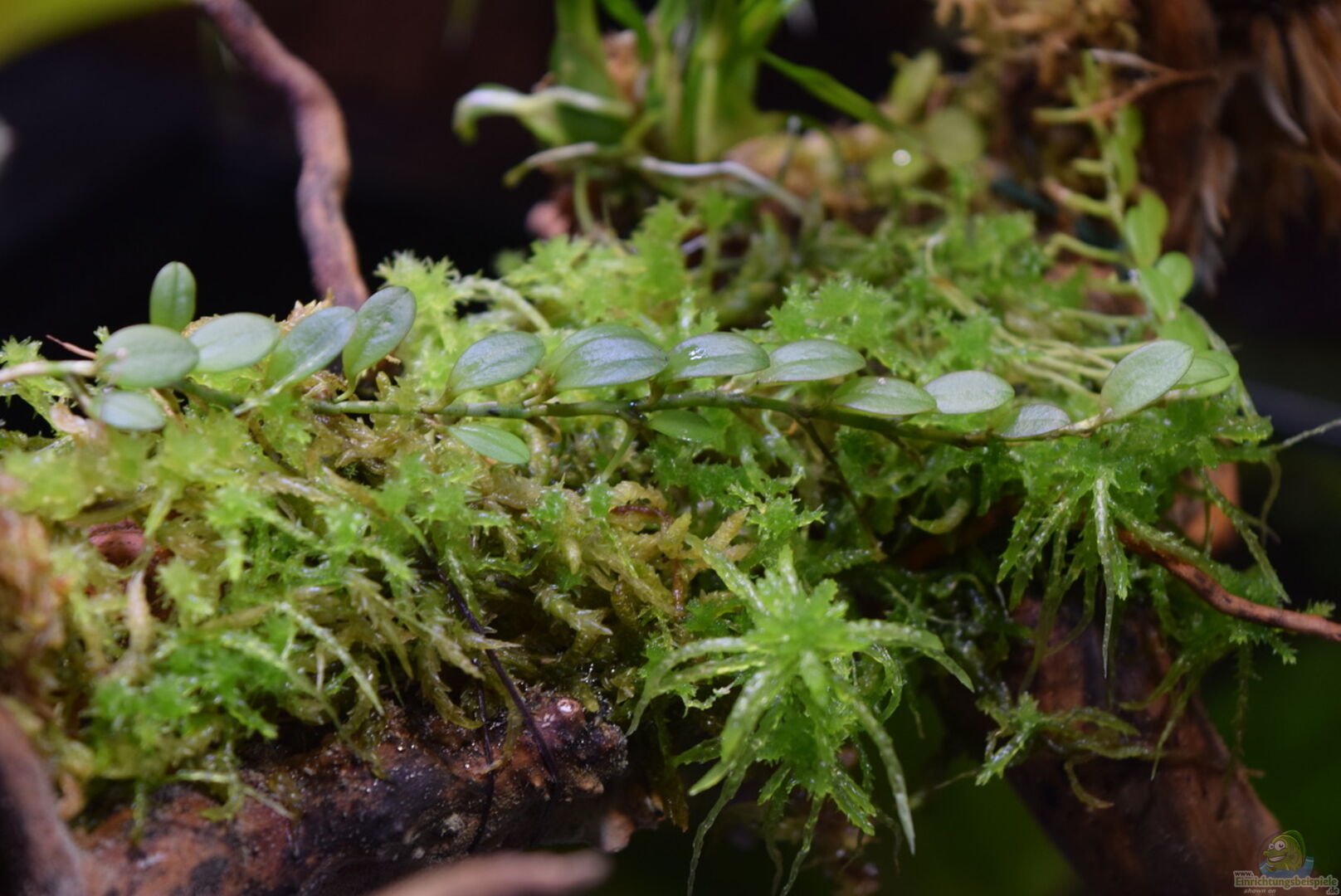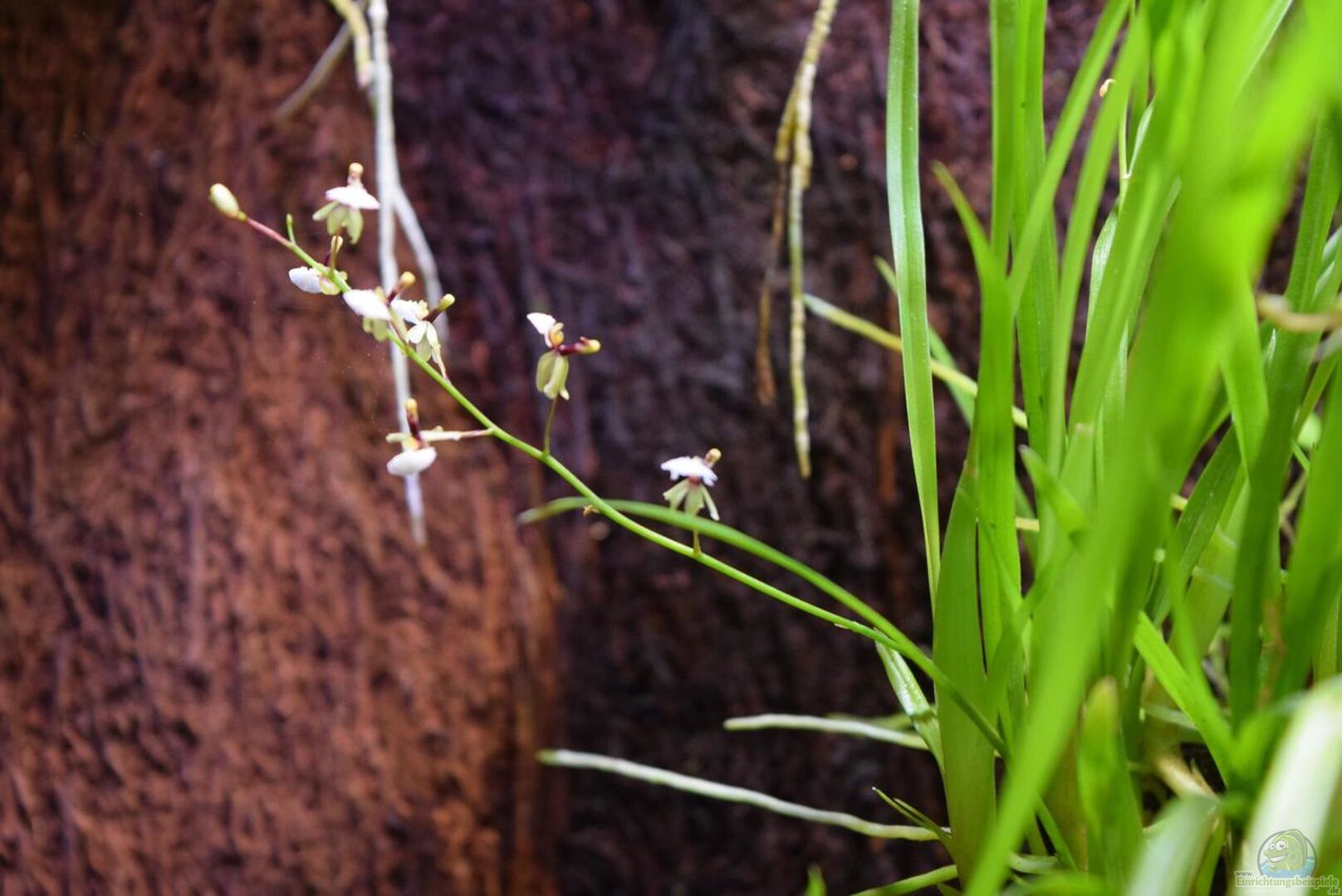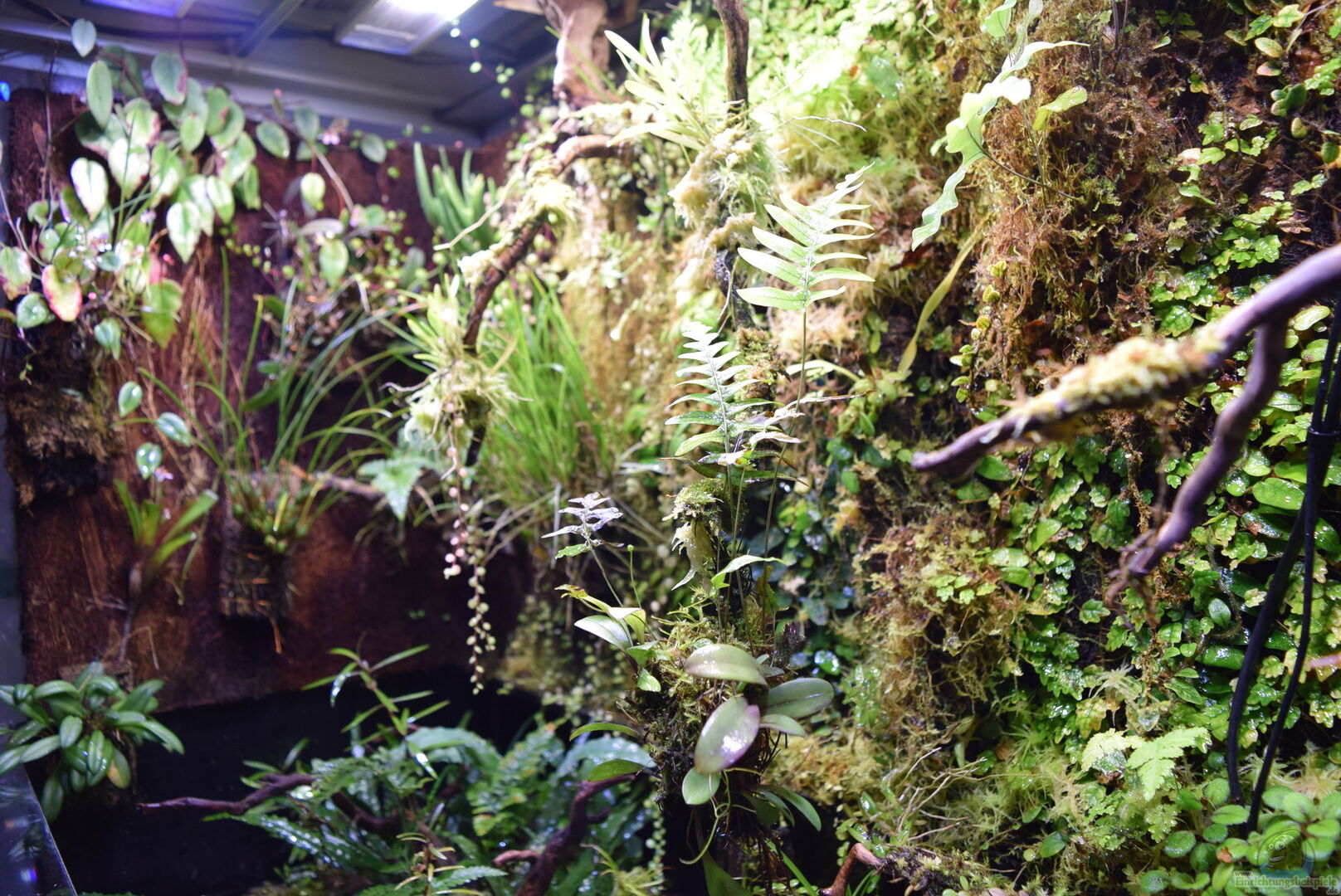 Neoregelia green pointet, Neoregelia schultesiana purple red, Epidendrum Porpax, Dischidia hirsuta, Microgramma reptans, Peperomia rostrata, Epidendrum cochleatum, , Gomesa radicans, Dendrobium wassellii, Barbosella cogniauxiana, Sphagnum-Moos, Ficus quercifolia, Hygrophila "Siamensis 53B", Microsorum pteropus 'Narrow' , Echinodorus schlueteri Leopard , Juncus Repens , Alternanthera reineckii "Rosaefolia", Restrepia trichoglossa, Stelis sp., Peperomia hoffmanii