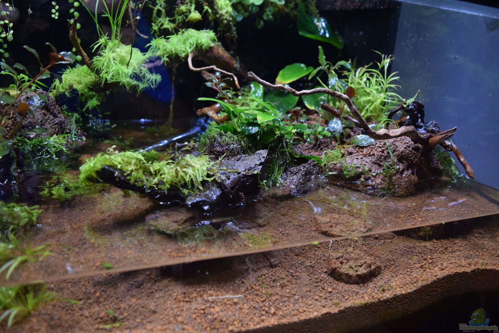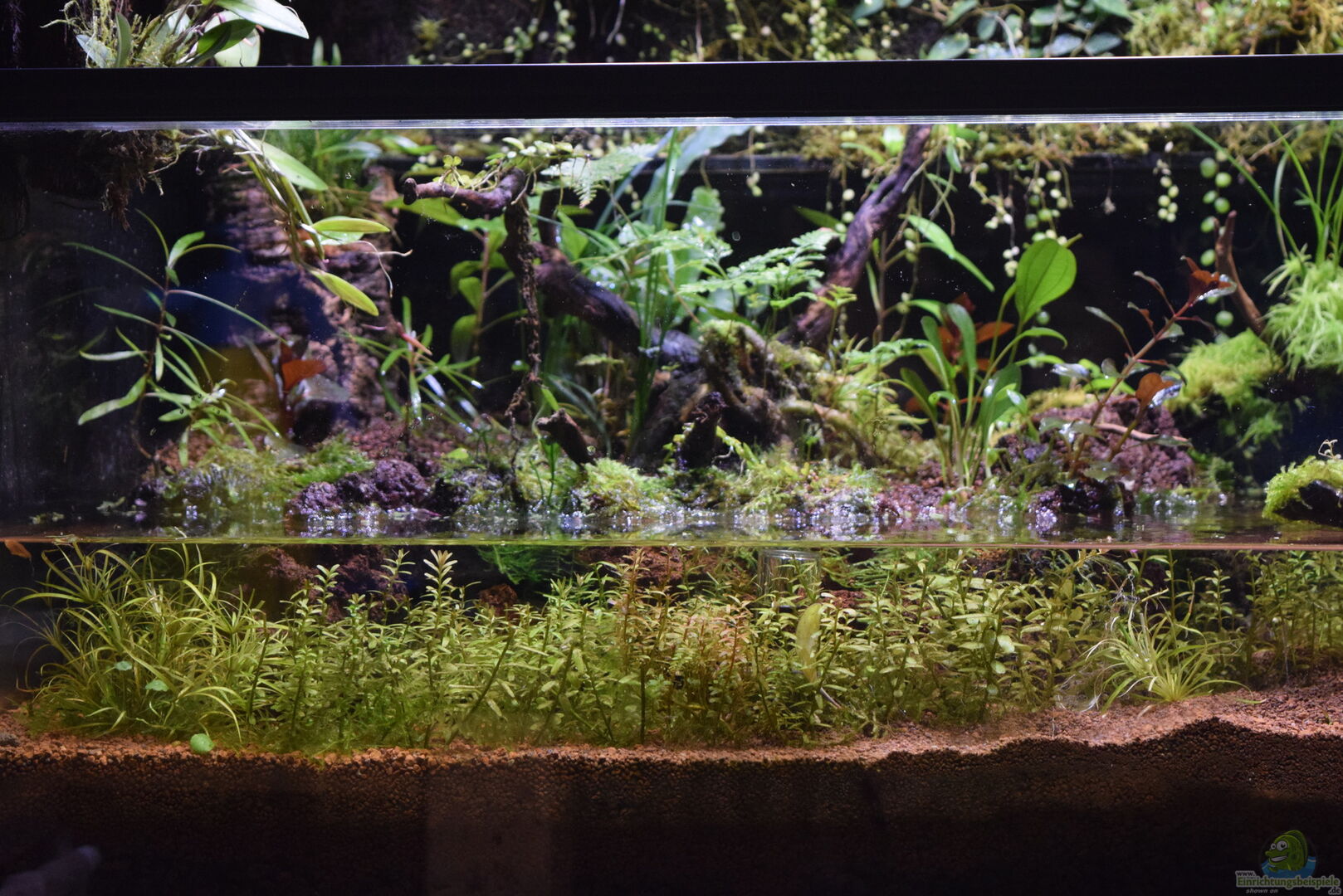 Eigentlich wollte ich nur ein bisschen alte und überwachsene Pflanzen ausmisten, was zu einer kompletten Umgestaltung des unteren Teils des Paludariums geführt hat. Schön ist, dass ich so ca. 15 Liter mehr Wasserinhalt habe und die Fische mehr Freiraum zum Schwimmen haben. Somit komme ich auch ca. 40-45 Liter Wasserinhalt.