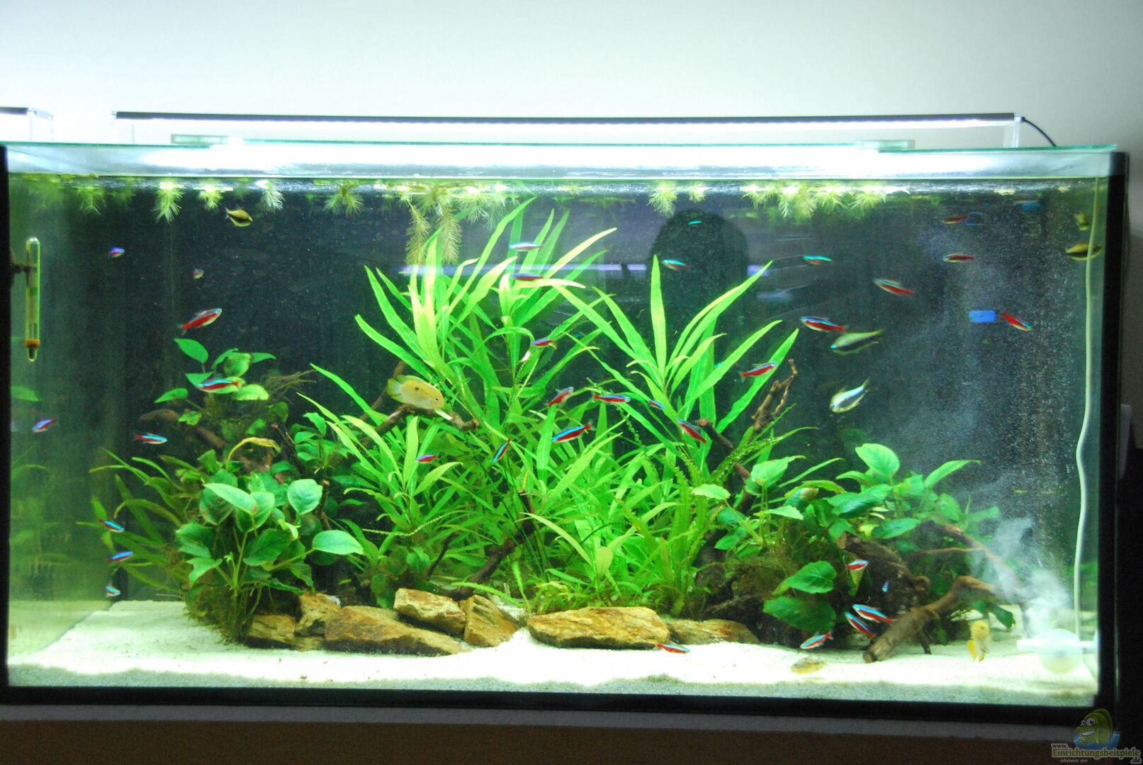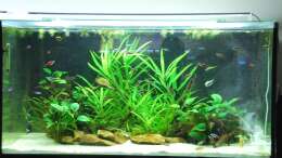 Hm, irgendwie hat sich mein Schwarm roter Neon Salmler verkleinert. Ebenso hat es ein Kaisertetra Weibchen dahin gerafft. Die Amano Garnelen haben ihre Angst Phase überwunden und laufen endlich über den Boden um diesen nach Fressbarem zu untersuchen. Auch getrocknete Blätter vom Walnussbaum sind willkommen.