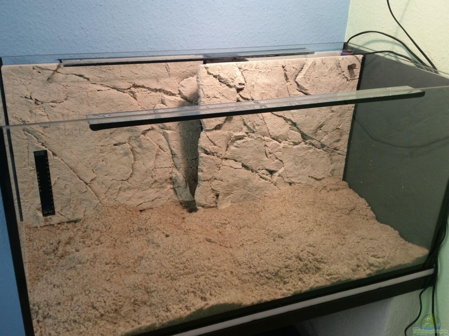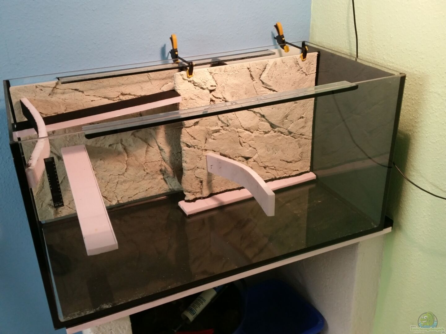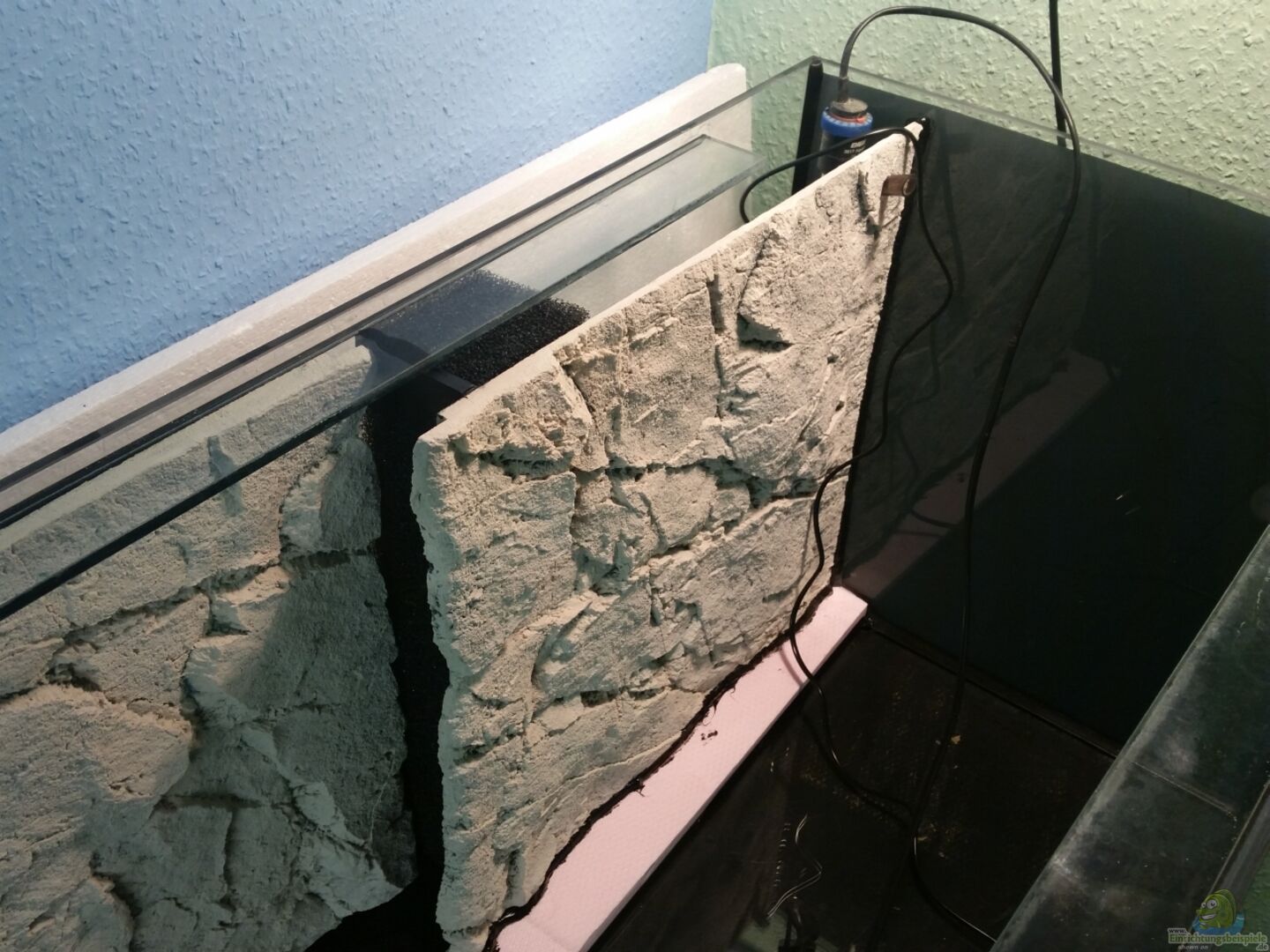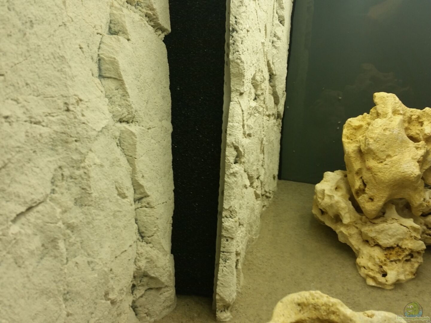 Als Rückwand habe ich zwei Slimline White Limestone Elemente der Firma Back to Nature gewählt. Diese werden so installiert das daraus eine Filterkammer entsteht. Inspiriert dazu hat mich das Beispiel auf der Homepage von Back to Nature. Als Steine habe ich für dieses Becken Lochsteine gewählt, diese passen gut zur Rückwand uns bieten viele kleine Verstecke. Die Anzahl ist absichtlich gering damit ich diese schnell heraus nehmen kann, wenn die Tiere den Besitzer wechseln.