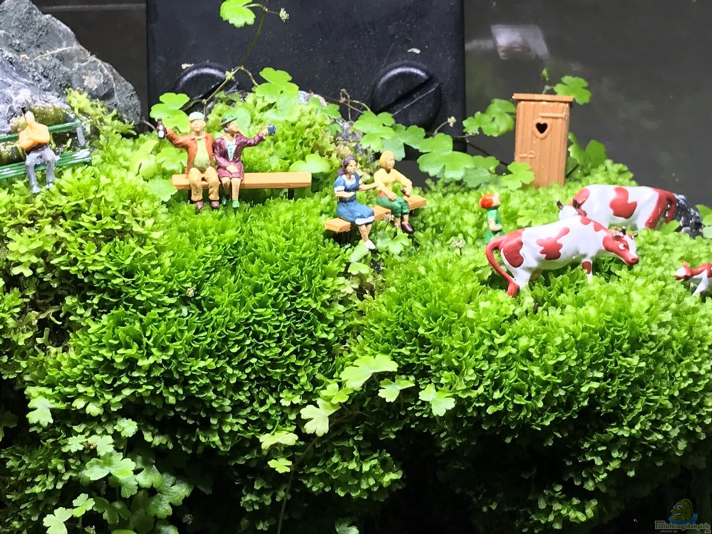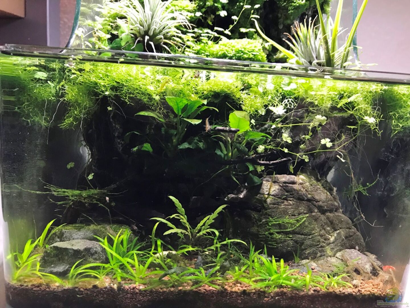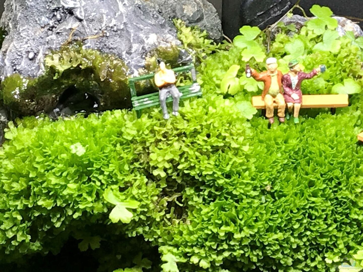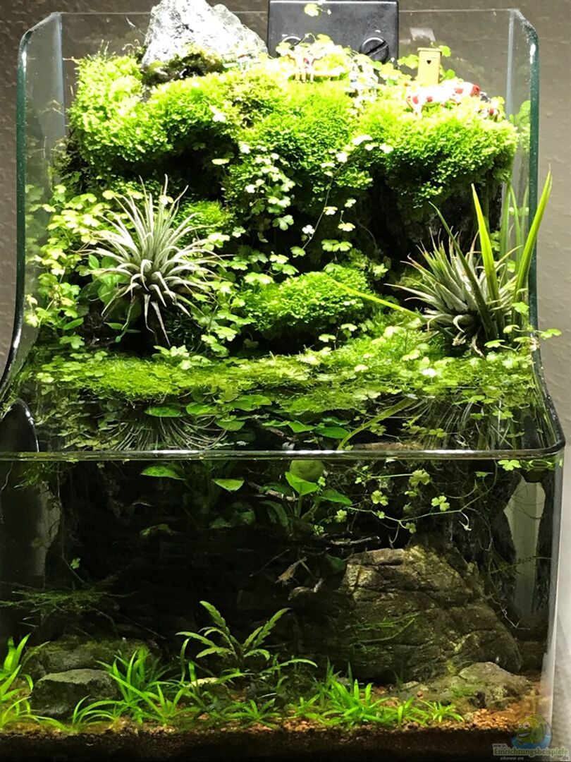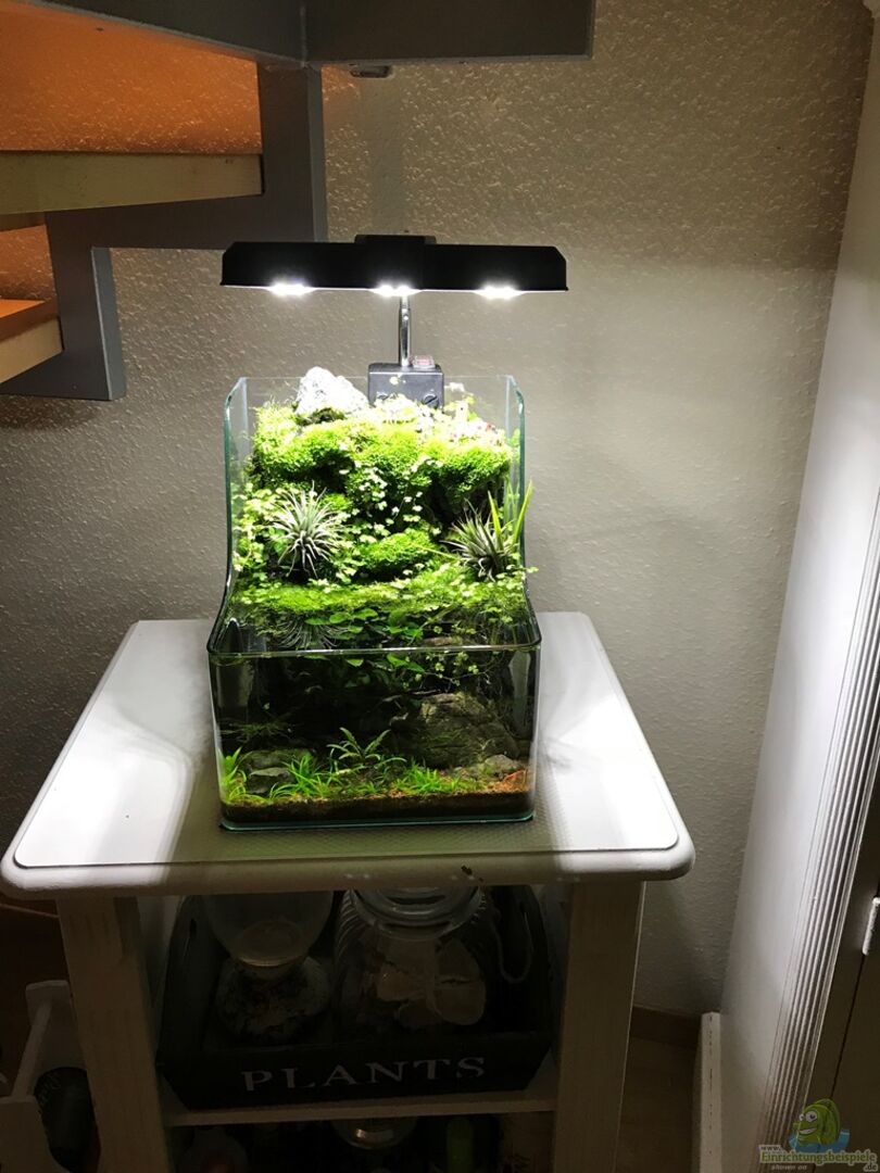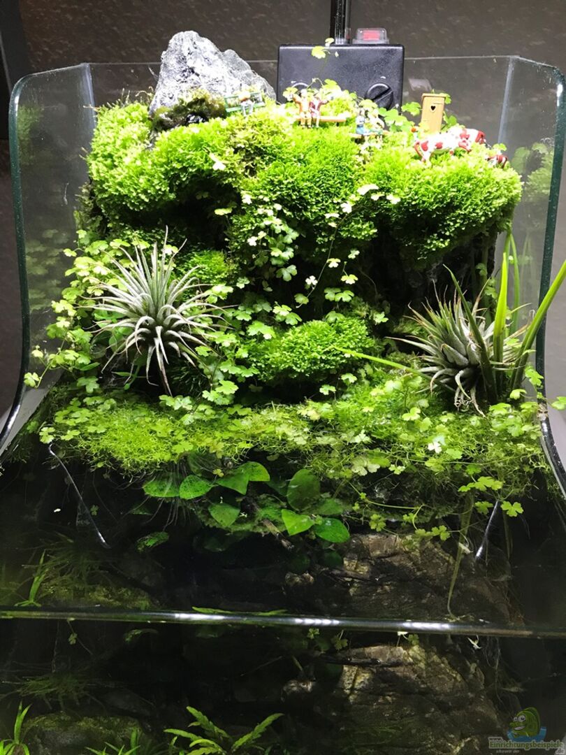 hab das Becken schon länger im Fokus und muss sagen, dass es immer besser aussieht. Es wächst langsam richtig schön zu und das Moos nimmt immer mehr Raum ein. Man könnte vielleicht die Plastikpflanzen durch echte ersetzen. Gut geeignet wären z.B. Zwergkalmus oder auch Spathiphyllum...da gibts auch kleinbleibende Sorten (beide kommen gut mit Staunässe klar)