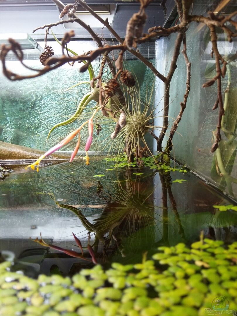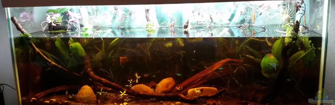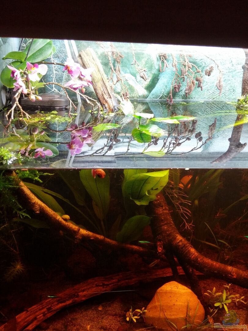 Da ich schon Armanogarnelen und Perlhunbärblingnachwuchs hatte, kam ein reines Amazonasbecken nicht in Frage, daher also ein Schwarzwasser- Gesellschaftsbecken im Amazonas-Stil. Pflanzen und Tiere entsprechen den geplanten Umweltbedingungen: mittlerer PH, mittelweiches Wasser, dunkle Färbung dew Wassers, leichte Ströhmung, Temperatur ca. 22 Grad. Die 3/4 Füllung des Becken erzeugt eine "ich schau in einen natürlichen Fluss"- Optik. So gibt es auch oberhalb des Wasserspiegels gestaltende Elemente. Die dunkel- rotbraune Färbung des Wassers und der leicht saure ph-Wert entsteht ausschlie??lich durch Erlenzapfen und Blätter, Walnussblätter und Au??enschale der Nüsse und Eichenblätter. Becken habe ich gebraucht bekommen und die senkrechten schwarzen Silikonfugen durch transparente ersetzt und neu verklebt.