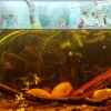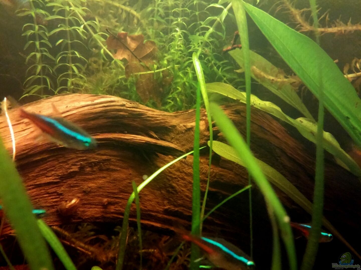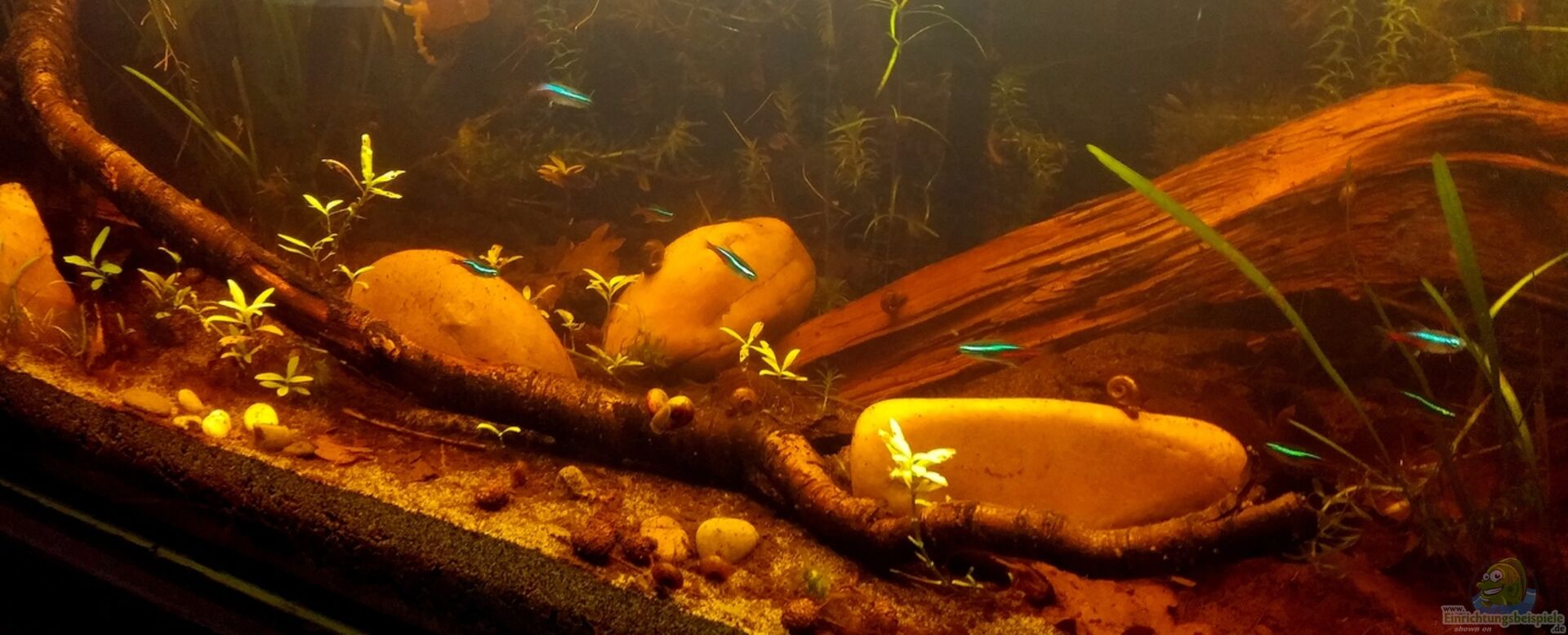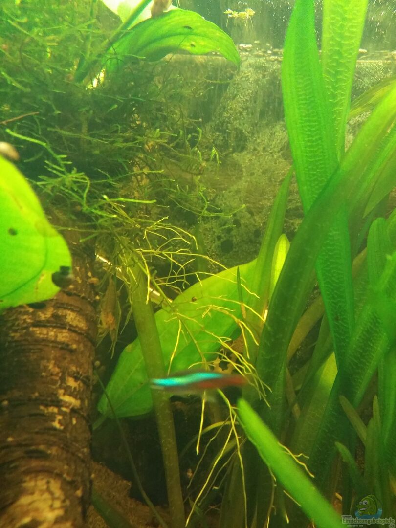 Es sollten Tiere sein, die sich zum Einen in einem Schwarzwasser-Becken mit Zimmertemperatur wohlfühlen, als auch meine schon vorhandenen Armanos und Perlhühner aufnehmen kann. Alle Tiere sind in etwa gleich gro?? und sind für ein friedliches Wesen bekannt. Daher folgender Besatz: 25 Neonsalmer, 8 Perlhunbärblinge (eigene Nachkommen), 4 Armanogarnelen aus meinem Garnelenbecken, Posthornschnecken, Geweihschnecken. Nach 2 Monaten Laufzeit des Beckens habe ich nun auch 6 Ohrgitterharnischwelse dazugesetzt. Posthorn- Turmdeckel- und Blasenschnecken sind auch drin.