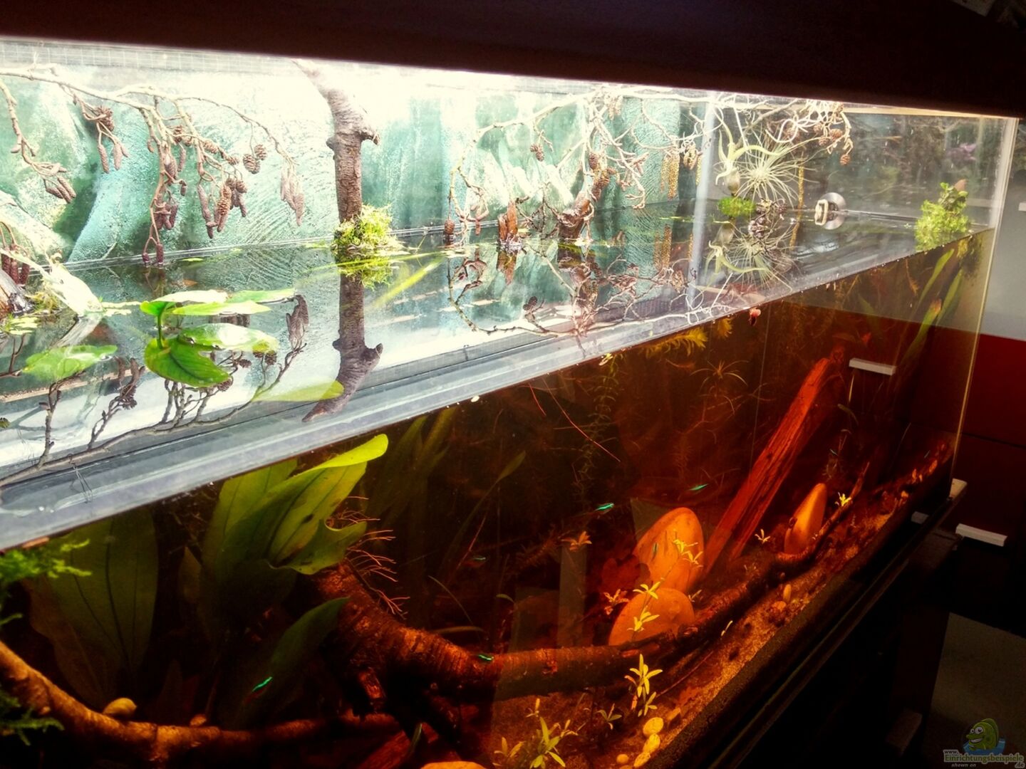 Du könntest den Eindruck noch verstärken, wenn du zB. Felsmodule an der Rückwand befestigst und die auch zT über den Wasserstand rausragen lässt.