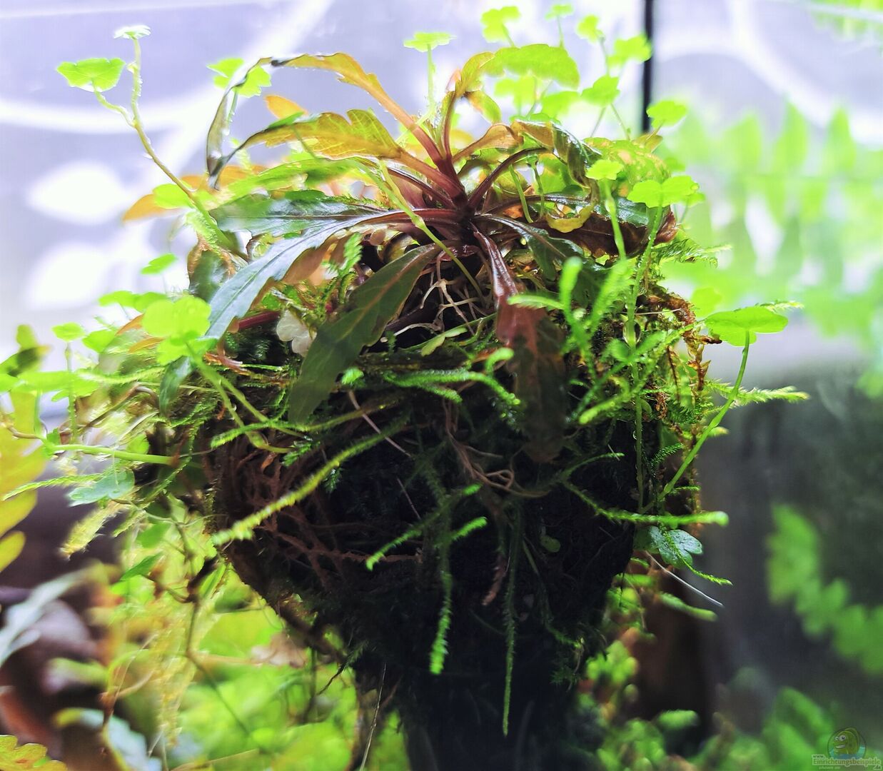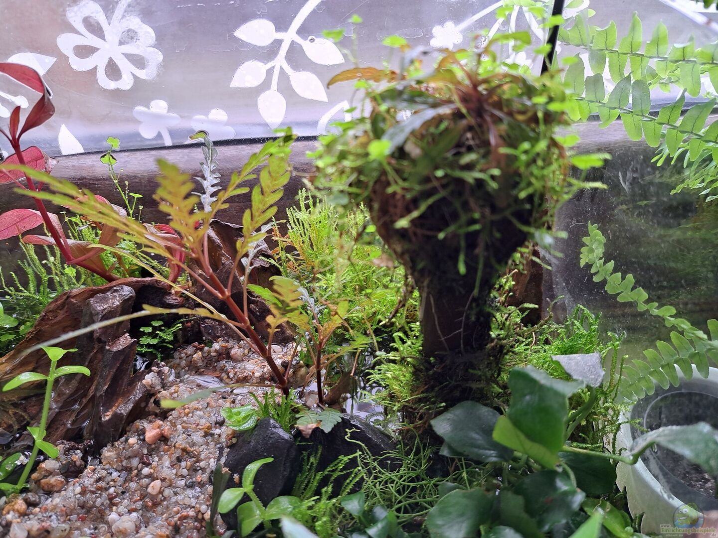 Momentan läuft ein neuer Versuch. Die beiden "Bäume" im Becken bestehen aus zwei Garnelenstämmen aus Ton auf die ich eine Soilkugel die mit Moos umwickelt ist gesteckt habe. Im Inneren der Garnelenstämme befindet sich Gaze die hoffentlich die Feuchtigkeit zusätzlich nach oben in die Kugel zieht. Bepflanzt sind die Soilkugeln mit einer Anubia nana und einer Bucephalandra und die Stämme mit Moos.