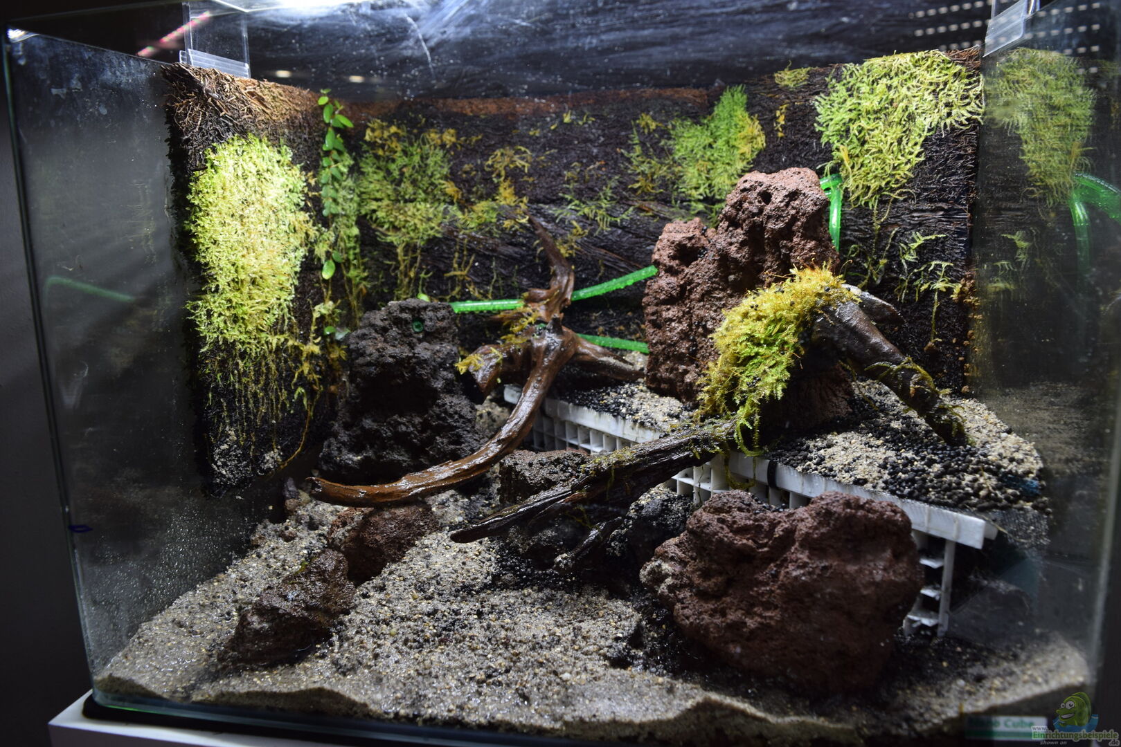 13.02.2018: Den Tank komplett umgestaltet. Das emers gewachsene Moos grösstenteils entfernt und im neuen Paludarium verbaut. Im Vordergrund das Soil entfernt, um Platz für eine kleine Wasserpfütze zu schaffen. Spiele mit dem Gedanken Red-Fire Garnelen einzusetzen.