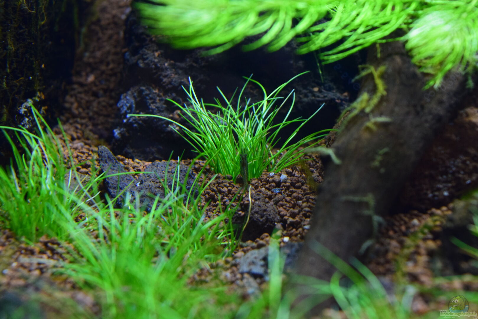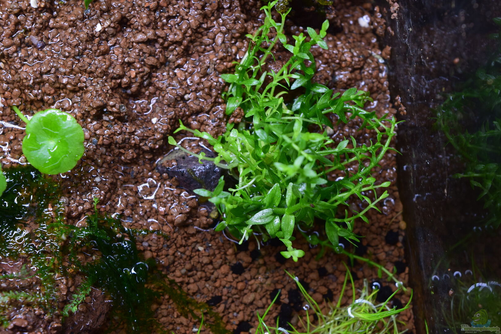 Pflanzliste: Pogostemon helferi (nicht mehr vorhanden) , Hydrocotyle verticillata (Quirlliger Wassernabel), Taxiphyllum barbieri (Javamoos), Leptodictyum riparium (Ufermoos), Pogostemon erectus (Indische Sternpflanze), Hydrocotyle tripartita (Dreiteiliger Wassernabel), Eleocharis Mini (Mini-Nadelsimse), Hydropogonella gymnostoma (Queen Moos), Gratiola viscidula (Klebriges Gnadenkraut), Limnophila hippuridoides (Tannenwedelähnlicher Sumpffreund)