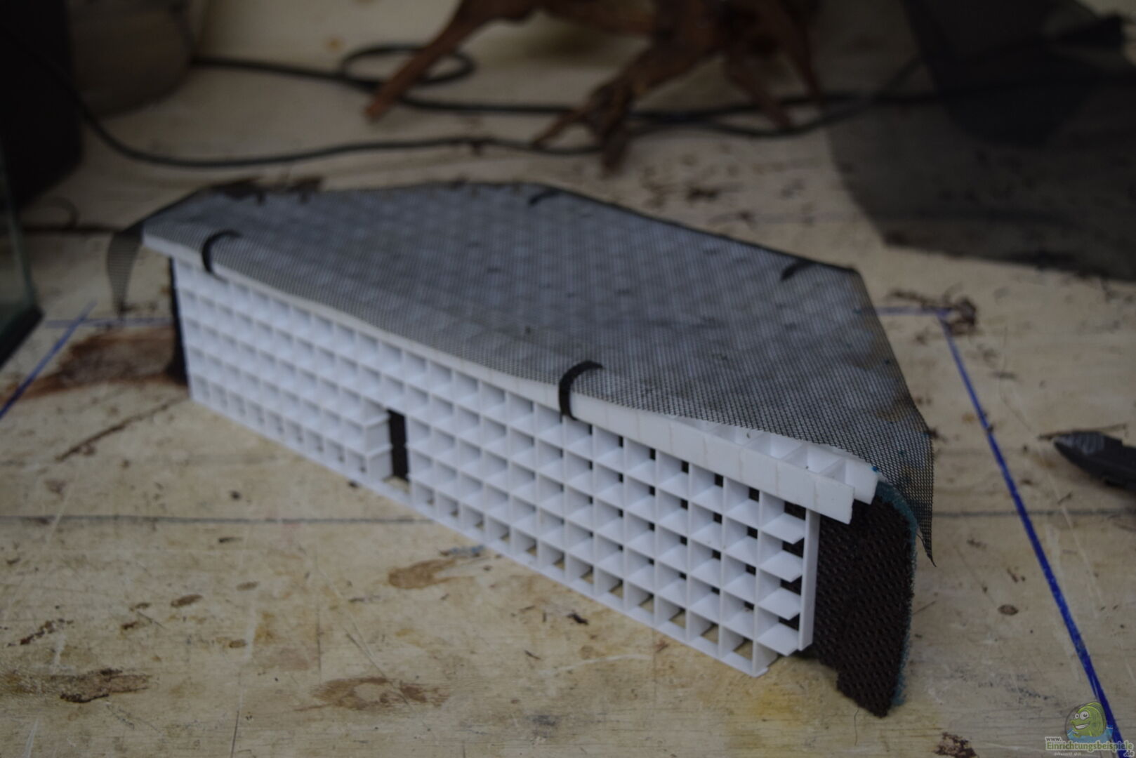 Der untere Aufbau besteht aus Lichtstegplatten, auf denen die Meeresaquarianer gerne in Korallen züchten. Diese ist in meinem Fall gut mit Fliegengitter abgedichtet, dass kein Substrat an die Pumpe kommt. Weiterhin habe ich eine Filtermatte installiert, die als Hamburger Mattenfilter fungiert. Das Wasser wird somit über die Wasserfallpumpe über den Verteiler aufs Holz geleitet und durch das Manado-Substrat und die Filtermatte zurück geleitet.