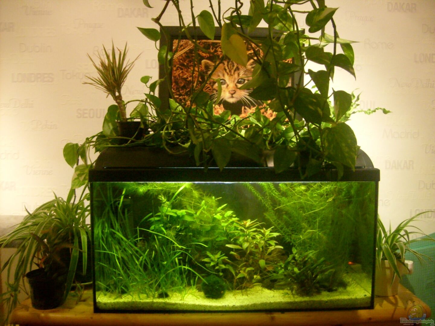 Es stehen jetzt diverse Pflanzen um das Becken verteilt.Arten sind unbekannt (au??er der 3m Efeutute, deren Ranken auf der Abdeckung liegen). Es wird evtl. nächste Woche ein Brett für die Pflanzen angebracht.