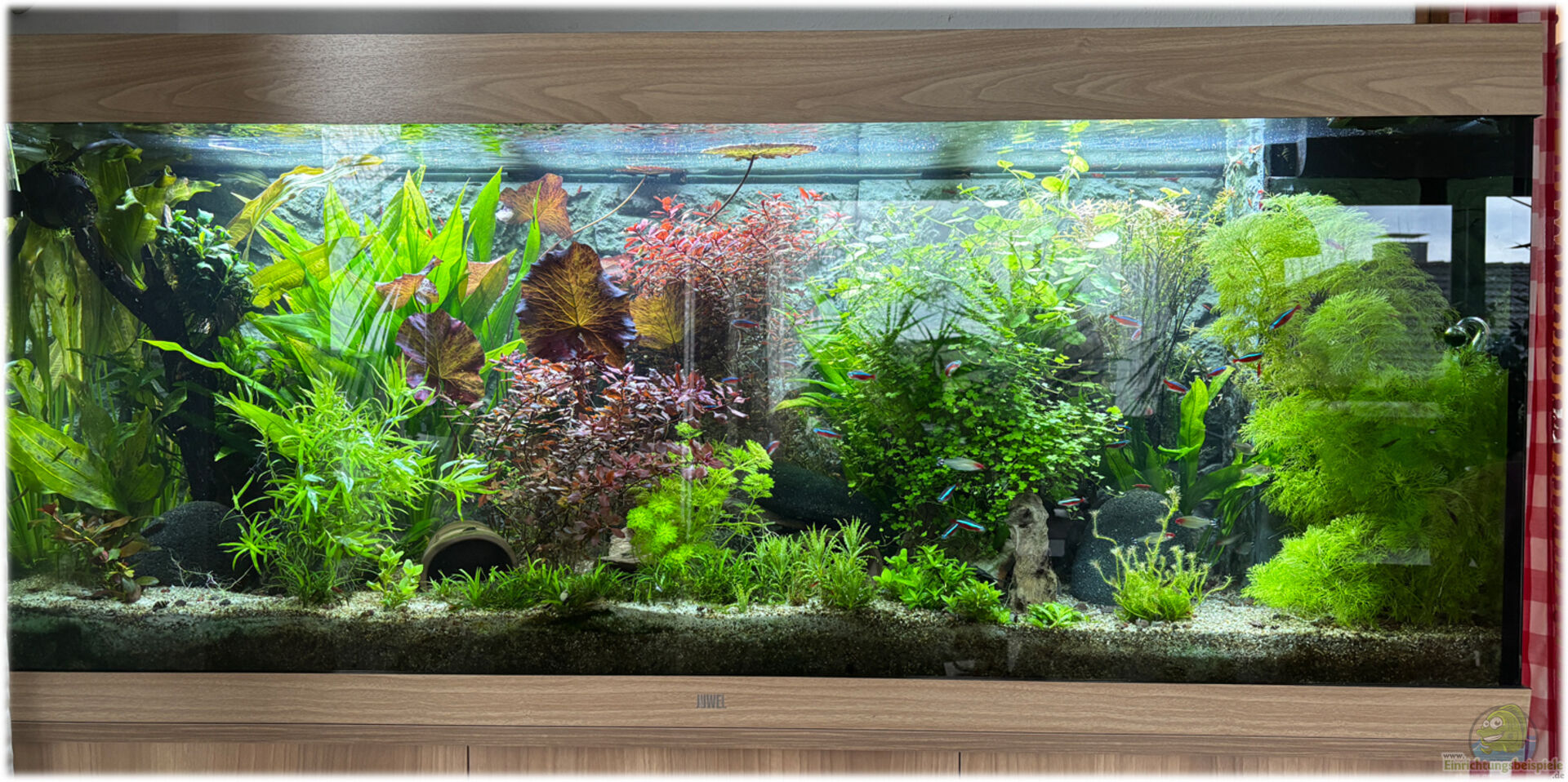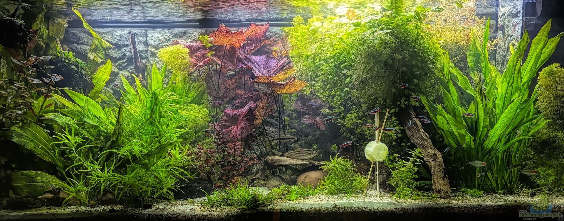 Becken mit dichter Bepflanzung, Innenfilter. Aquarienrückwand Steine in 3d Optik.