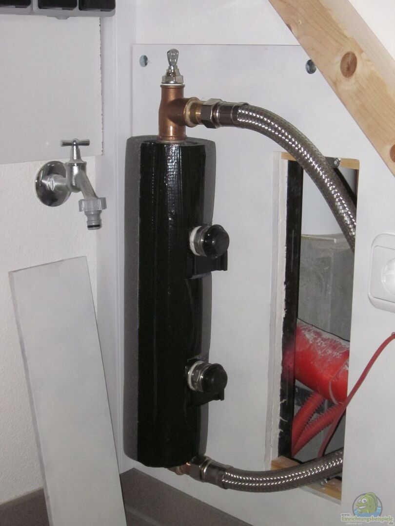 Geheizt wird das Becken über einen Edelstahl Wärmetauscher, der an der Zentralheizung hängt. Durch eine Pumpe wird das Aquarienwasser durch den Wärmetauscher gepumpt. Um abgestandenes Wasser im Tauscher zu vermeinden wird alle 4h einmal komplett durchgespült.
