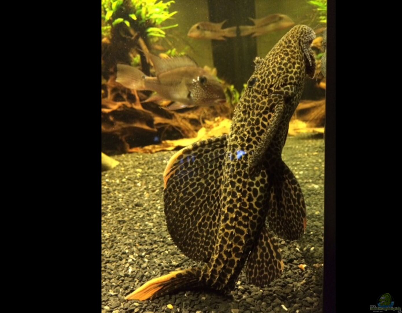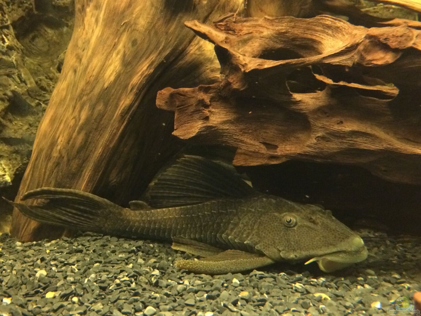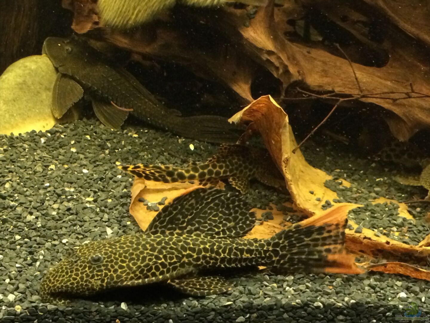 Es sind 4 L-Welse im Becken. 2 Ancistomus cf. sabaji L75 (16 &18cm), beide ungefähr 4-5 Jahre alt und sehr aktiv und harmonisch. Zusätzlich 2 Pseudacanthicus cf. leopardus L 114 (25&30cm) jeweils über 20 Jahre im Aquarium, aber davor schon teiladulte Wildfänge. Der kleinere ist recht scheu, aber der gro??e liegt immer auf der Freien Fläche links im Becken.
