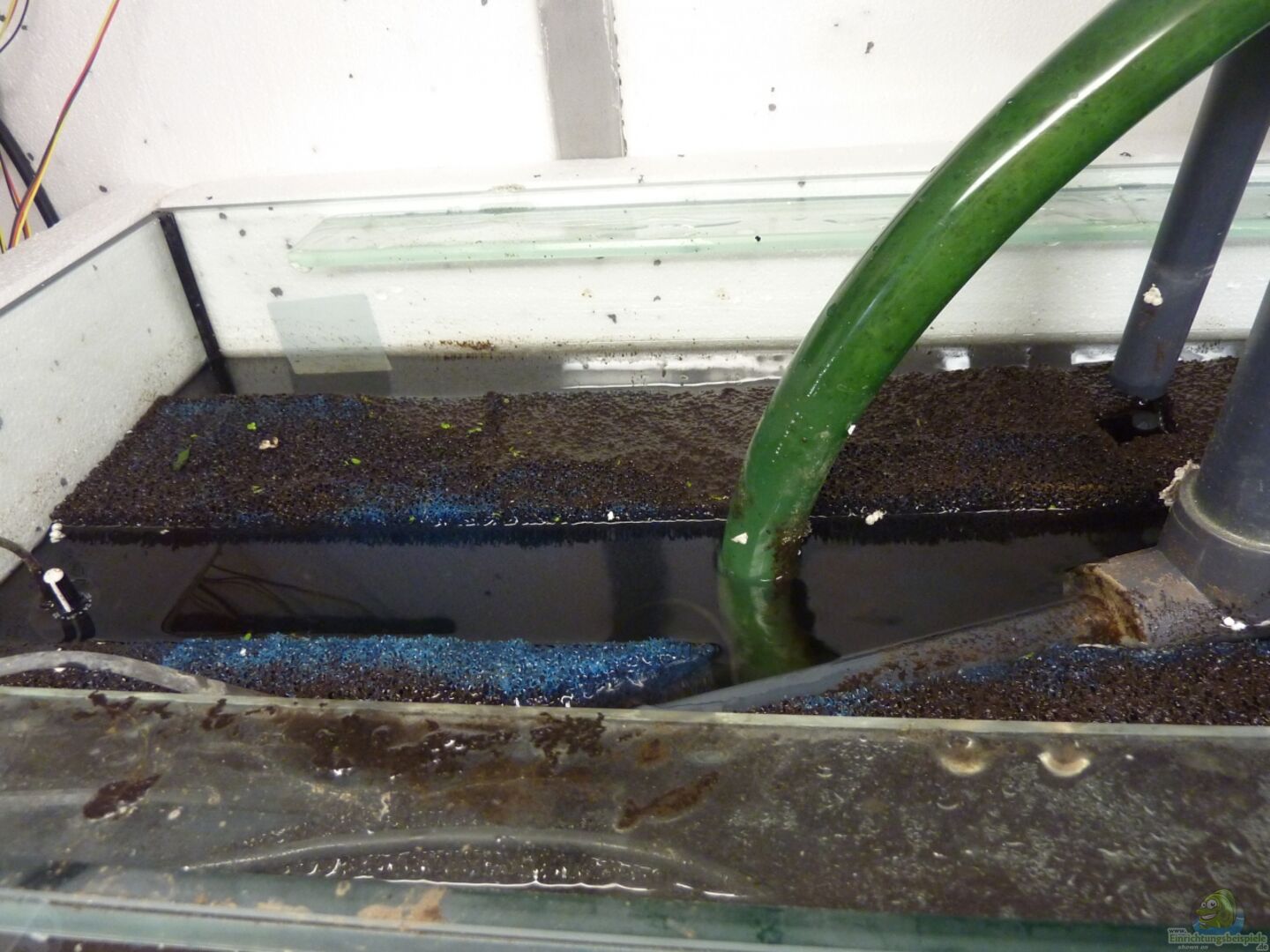Im Unterschrank steht ein Filterbecken (100x40x50) in welches der ??berlaufschacht in 2 Rohre aufgeteilt mündet. In diesem sind 2 Filtermatten ( je 100x50 mit einer Dicke von 10cm) die wie in einem Hamburgermattenfilter durchflossen werden. Das Wasser wird nun durch eine NewJet4500 Förderpumpe zurück ins Becken gepumpt. Unter meinen Bedingungen schafft diese Pumpe ca. 2800l/h, also eine mehr als 3-fache Umwälzung des Beckens. Die Durchflussgeschwindigkeit im Filter beträgt hierbei ca. 6cm/min.