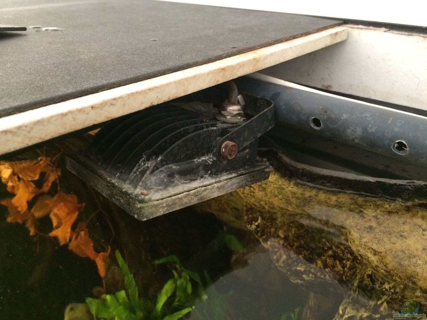 Das Becken sollte sehr dunkel sein, au??erdem wollte ich Energie sparen, weshalb zur Beleuchtung lediglich eine 145 cm lange 32 Watt Leuchtstoffröhre mit Reflektor dient. Diese wird über eine "Arcadia Ultra Seal" Betriebseinheit betrieben.