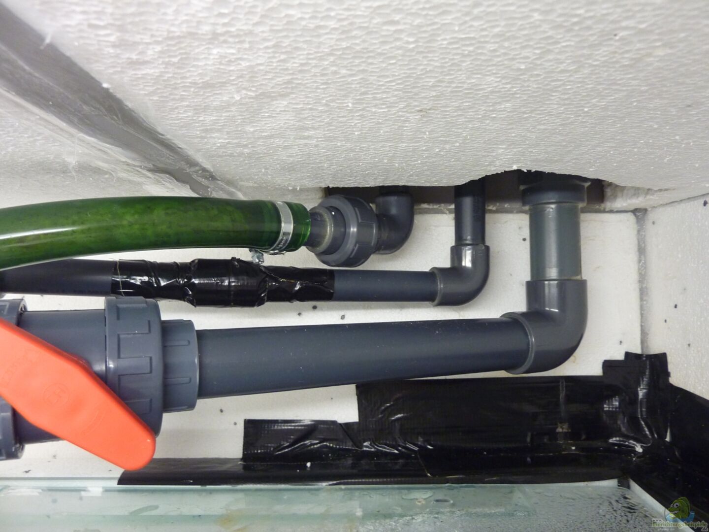 Das Becken wurde von "Brillantaquarien" gebaut, hat 2 Quer- und 2 Längsverstrebungen und ist Wulstverklebt. Auf der rechten Seite ist ein ??berlaufschacht mit 2 Kammern und 3 Bohrungen (2x 25mm 1x40mm) eingebaut. Dieser wird jedoch durch die 3D-Rückwand von "fit-im-fish" verdeckt.