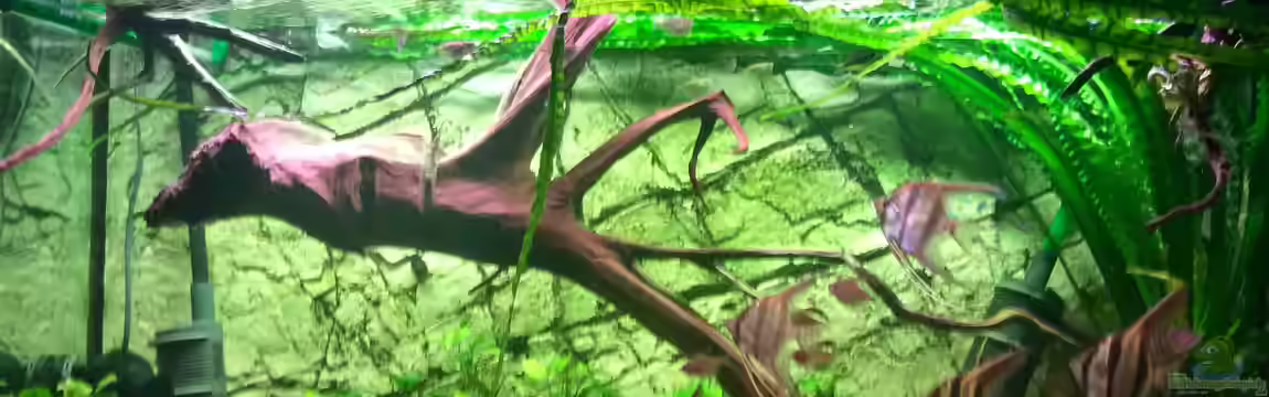 Linke Seite kleine Mangroven Wurzel stehend mit einer Anubia bewachsen. 7 kleinere Wels Höhlen 1 gro??e mit seiteneingang und ein Iglu sowie 2 mal halbe kokosnuss