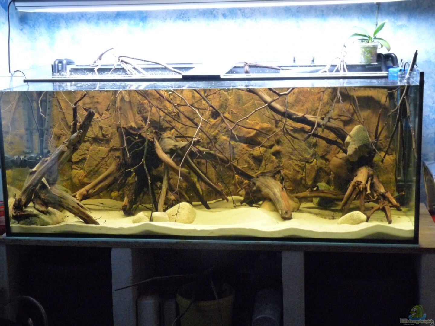 Habe versucht das Becken so naturnah wie möglich zu gestalten und dennoch genügend Platz zum schwimmen zu lassen. Hatte lange damit gezögert, wirklich komplett auf Pflanzen zu verzichten, aber es hat sich wie ich finde gelohnt. Mir gefällt es, den Fischen scheint es zu gefallen und die Besucher stehen fasziniert davor und sind verwundert, welche Wirkung ein Pflanzenloses Becken doch haben kann.