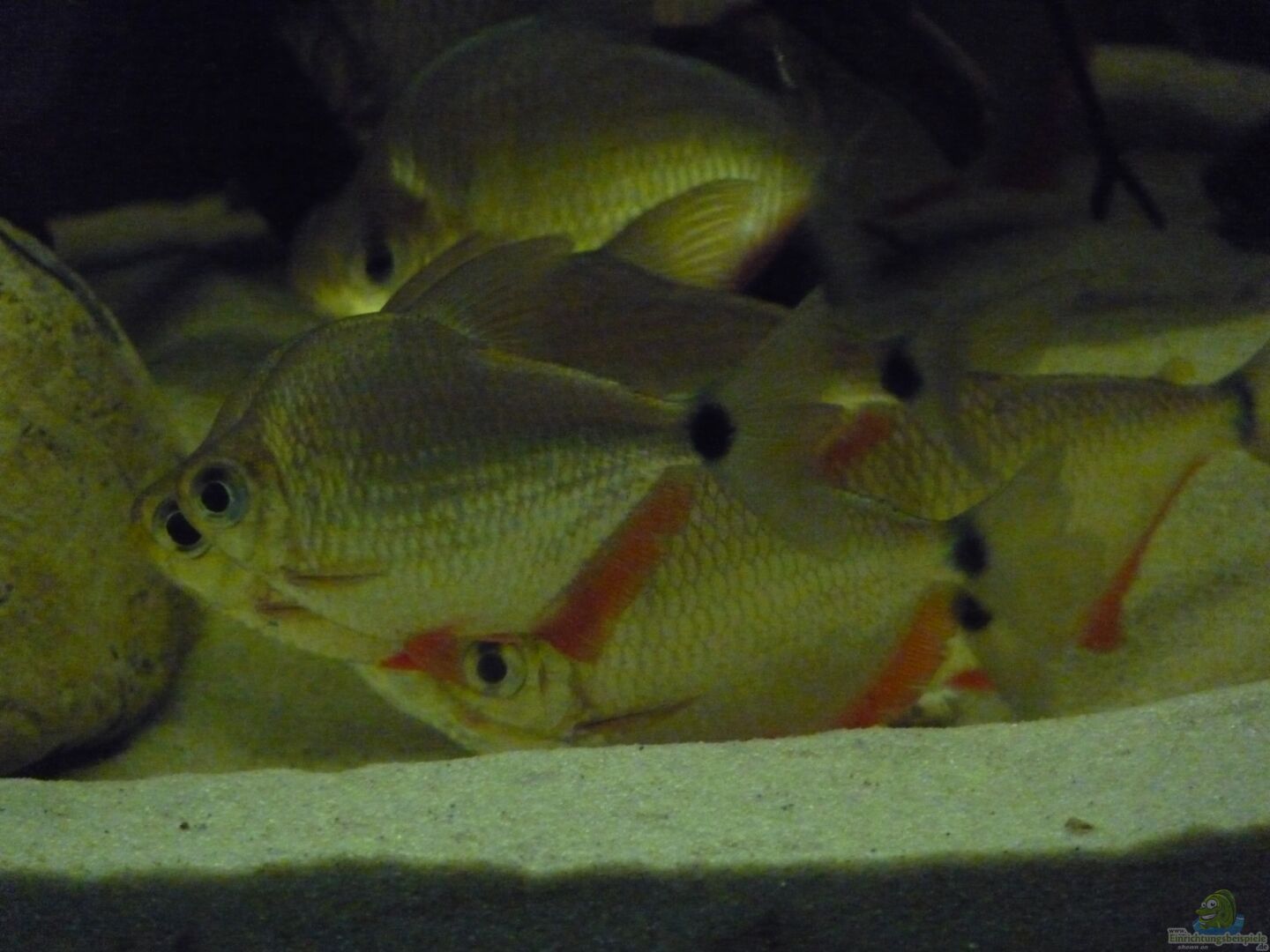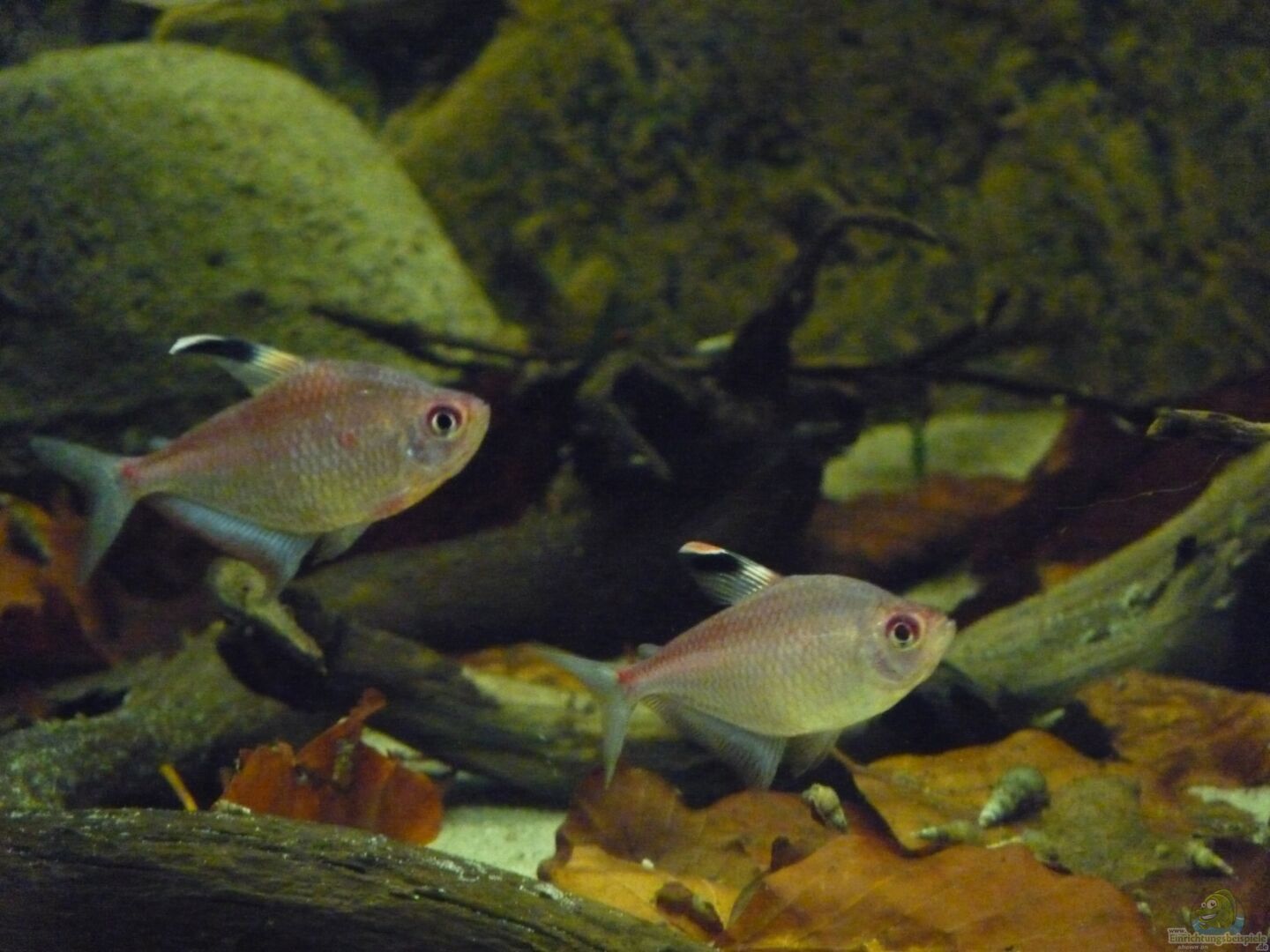 Die Rotrücken Kirschflecksalmler habe ich zunächst auf 12 Tiere aufgestockt, ehe dann 15 Tetragonopterus argenteus hinzukamen. Aufgrund des Verhaltens und der Grö??e wurden die Kirschflecksalmler aber schnell in mein zweites Becken umgesiedelt, in diesem Becken gingen sie leider unter und bekamen keinen Stich.
