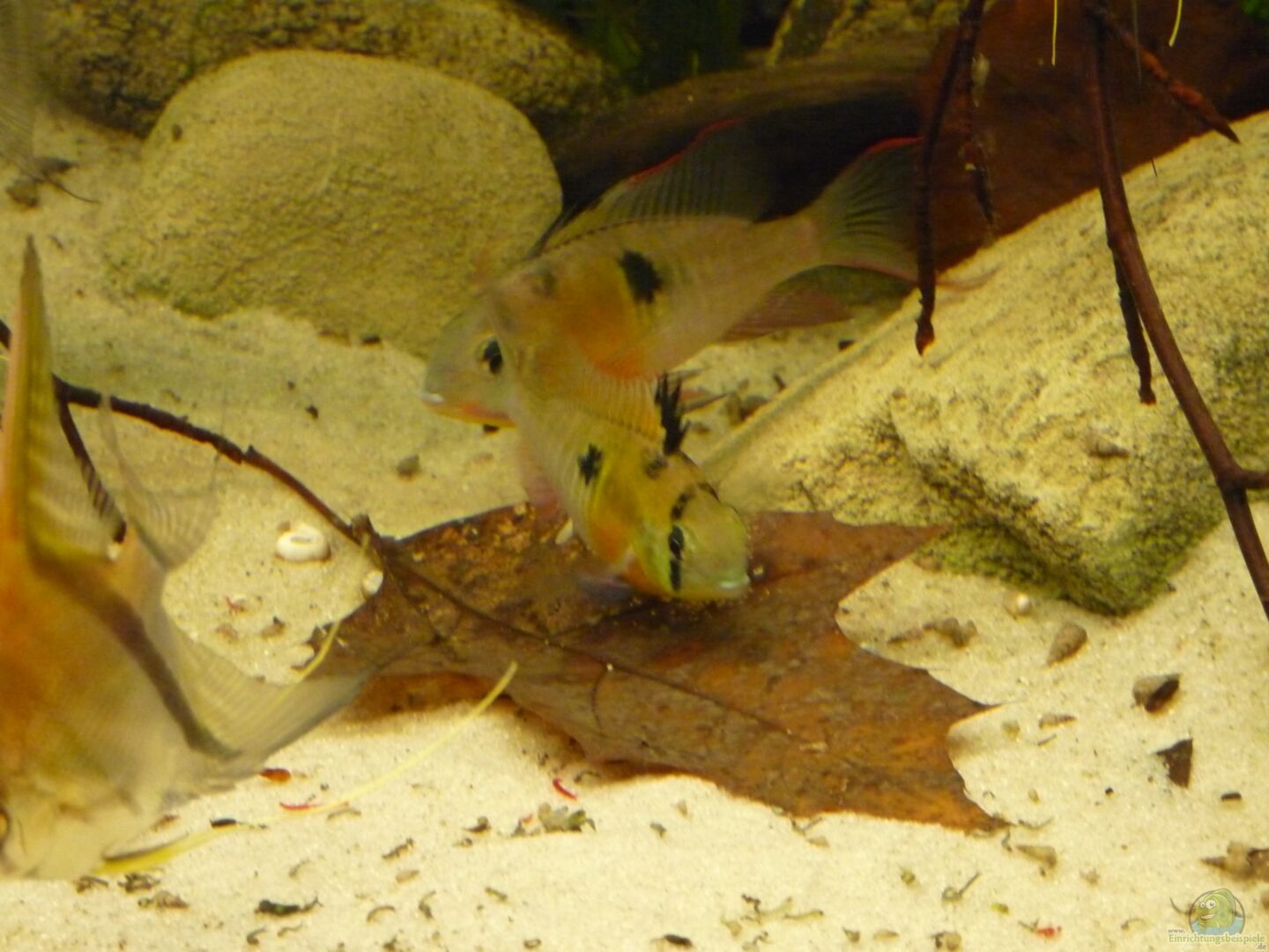 Die Microgeophagus altisinosa haben mal wieder ein Gelege zum Freischwimmen gebracht und das Männchen ist eifrig mit der Verteidigung beschäftigt, während sich die Skalare über das leckere Lebendfutter freuen.