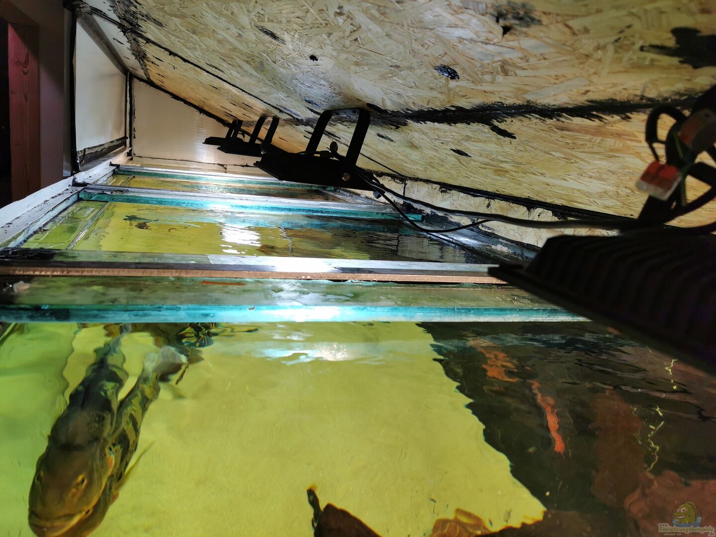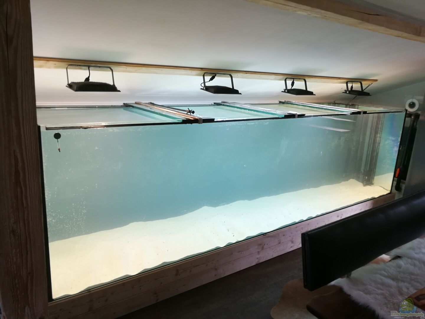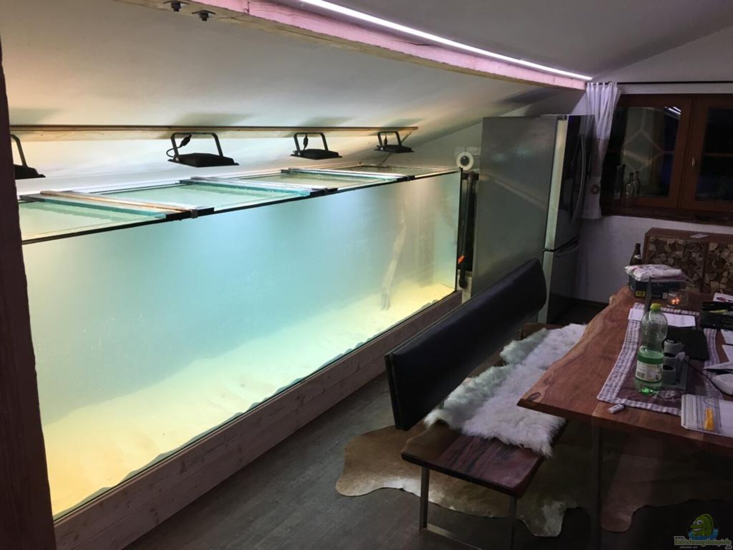 steht im ersten Stock und wird mit U Träger gestützt die in der mauer geankert sind.Der Unterbau ist mit einer einstellbaren Eiesenkonstruktion gemacht wo eine 3 cm Holzpatte drauf liegt.Das aquarium ist nach oben hin offen, wegen den Wasserdampf und der Feuchtigkeit ist jedoch der obere Bereich bis zur Decke dampfdicht verbaut.