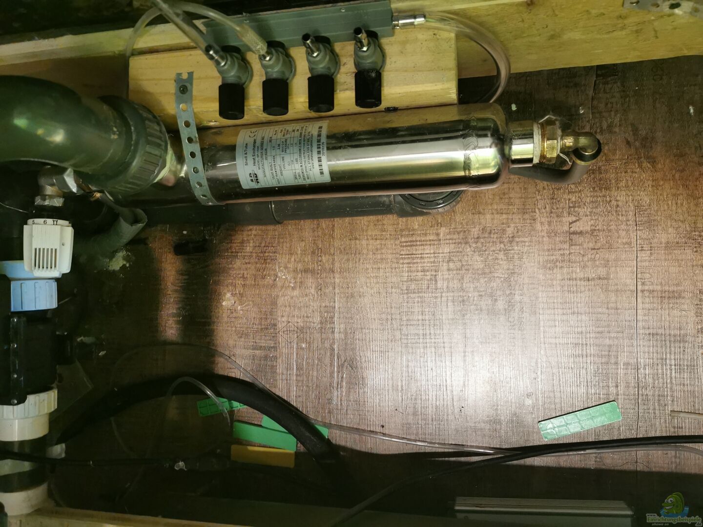 Aquariumwasser wird über den ??berlaufschacht mit Bodenabfluss mit 2 50mm Rohre in den Vliesfilter geleitet.Von Vliesfilter aus geht es dan durch das 500l Filterbecken in dem sich Bürsten, simporax, Lavagestein, Filtermatten und k1 filtermaterial befinden. Danach wird das aufbereitete Wasser wieder zurück über den Durchlauferhitzer ins Aquarium gepumpt.