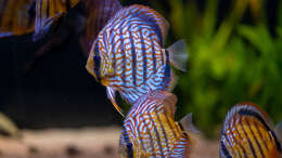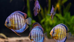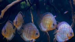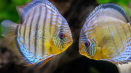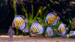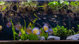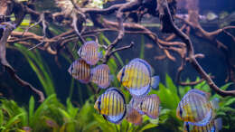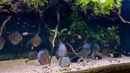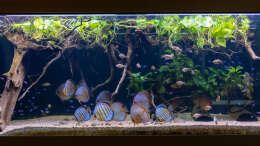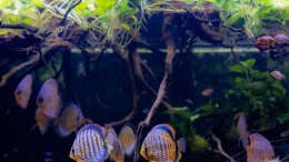 Die gro??e Diskus Gruppe, mit 16 Diskus ist bis jetzt die harmonischste Zusammensetzung. Jetzt beschäftige ich mich seit >20 Jahren mit Diskus. Meine Beobachtung ist, dass eine Gruppe >15 verschiedenen Alters am friedlichsten harmoniert. Auch habe ich gute Erfahrung gemacht eine Gruppe Jungtiere (>10 cm) zu einer Gruppe ausgewachsener Diskus zu setzen (nach Quarantäne bzw. aus parasitenfreier Zucht). Besonders die Wildfangdiskus haben hohe soziale Kompetenz in der Gruppe und schlichten Streit zwischen den Nachzuchten, obwohl die Wildfänge nicht mehr die Leittiere sind.