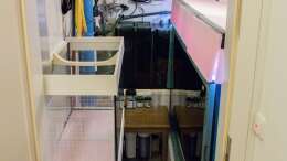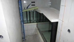 Alle Anschlüsse (Warmwasser, Kaltwasser, Elektrik, Abfluss in der Wand ~10cm unter der Höhe des oberen Aquariumsteges, sowie Abfluss im Boden wurde im Zuge der Sanierung neu in den Technikraum verlegt.