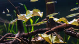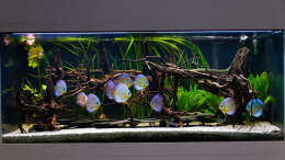 Bei den verschiedene Scapes die ich gestaltet habe fühlen sich die Diskus mit Abstand bei folgender Variante am wohlsten. Holz von oben ins Aquarium hängend, ergänzt mit Abschattung durch Pflanzen an der Wasseroberfläche. Hier fand nach Umgestaltungen spontan ein aktiveres Verhalten statt. Bedeutet freies schwimmen im gesamten Becken, mehr Farbpracht, interessanten Verhalten in der Nacht (Leittier vorne, dahinter die Gruppe untern den ??sten).