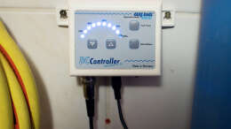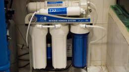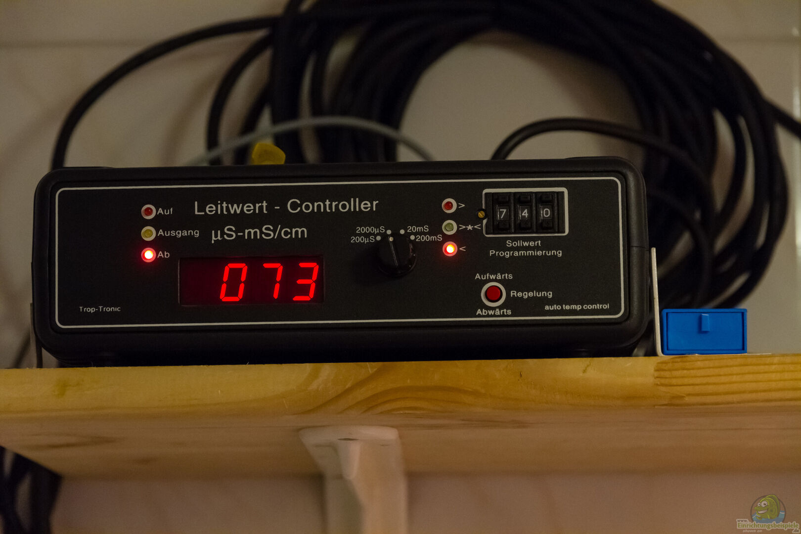 5-stufige Umkehrosmoseanlage 500 GPD Side Stream Plus (1.892 Liter Tagesleistung, Druckerhöhungspumpe, automatisches Spülventil): Diese wird von vom Leitwert Controller sowie einer Zeitschaltuhr geregelt. Die Praxis hat gezeigt dass eine Regelung nicht notwendig ist. Das Aquarium wird mit 100% Osmosewasser gefüllt. Leitwert von ca. 100 µS/cm stellt sich über Düngung und Fütterung ein wenn pro Tag die Osmoseanlage 5x15 min läuft.