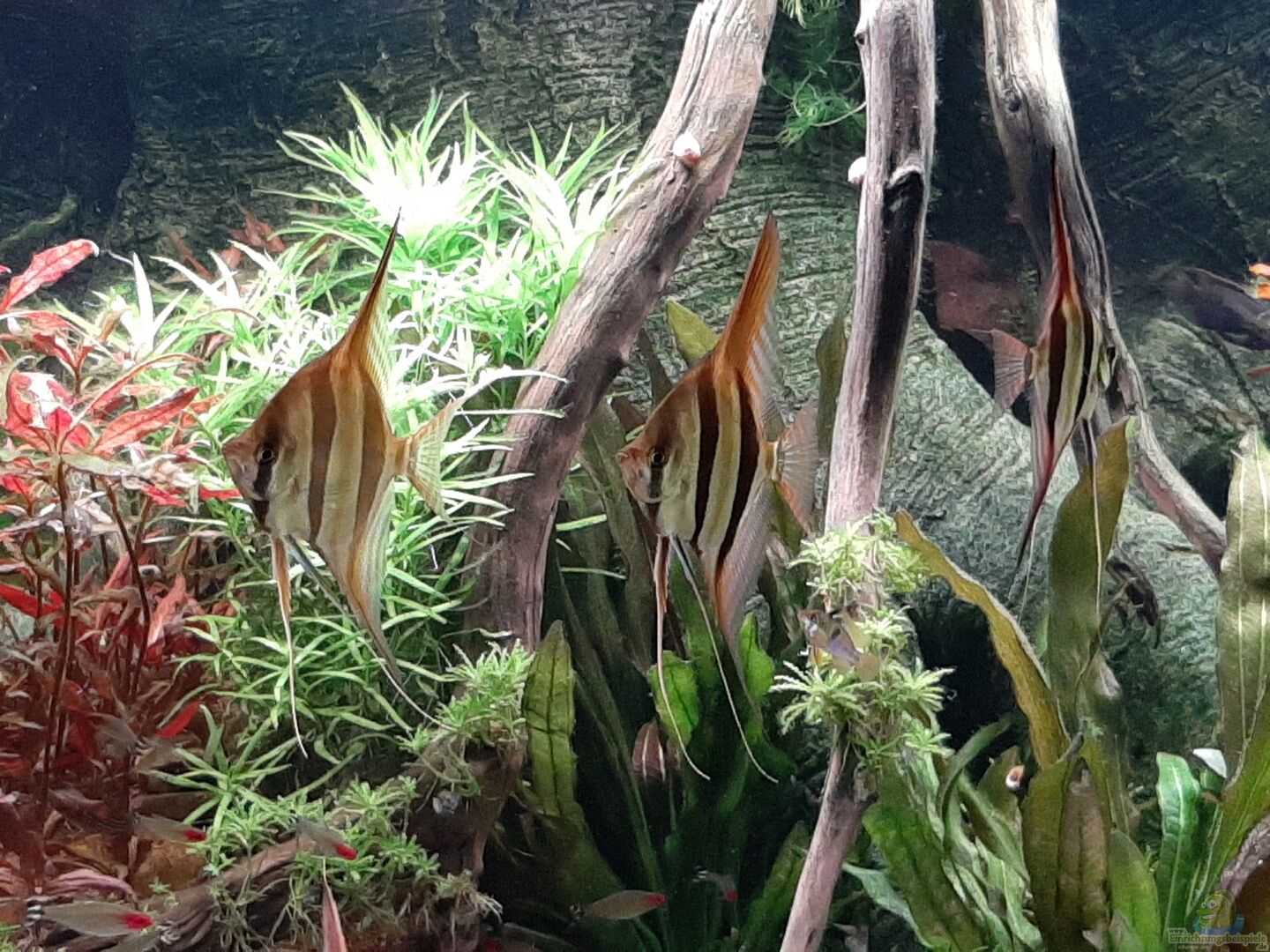 Nachdem die Echinodorus 'Ozelot' mit ihrer Ausdehnung viel zu viel beschattet hat und zu viel Platz einnahm, habe ich sie entfernt und an ihrer Stelle ein paar Stengel Alternanthera reineckii 'Cardinalis' gesetzt. Zudem gefielen mir die Heteranthera zosterifolia-Stengel nicht mehr. Dort haben nun Hygrophila corymbosa Pflänzchen Platz gefunden. Das Moss auf zwei der ??ste musste ich beschneiden und wieder in Form bringen = mit Draht aufbinden.