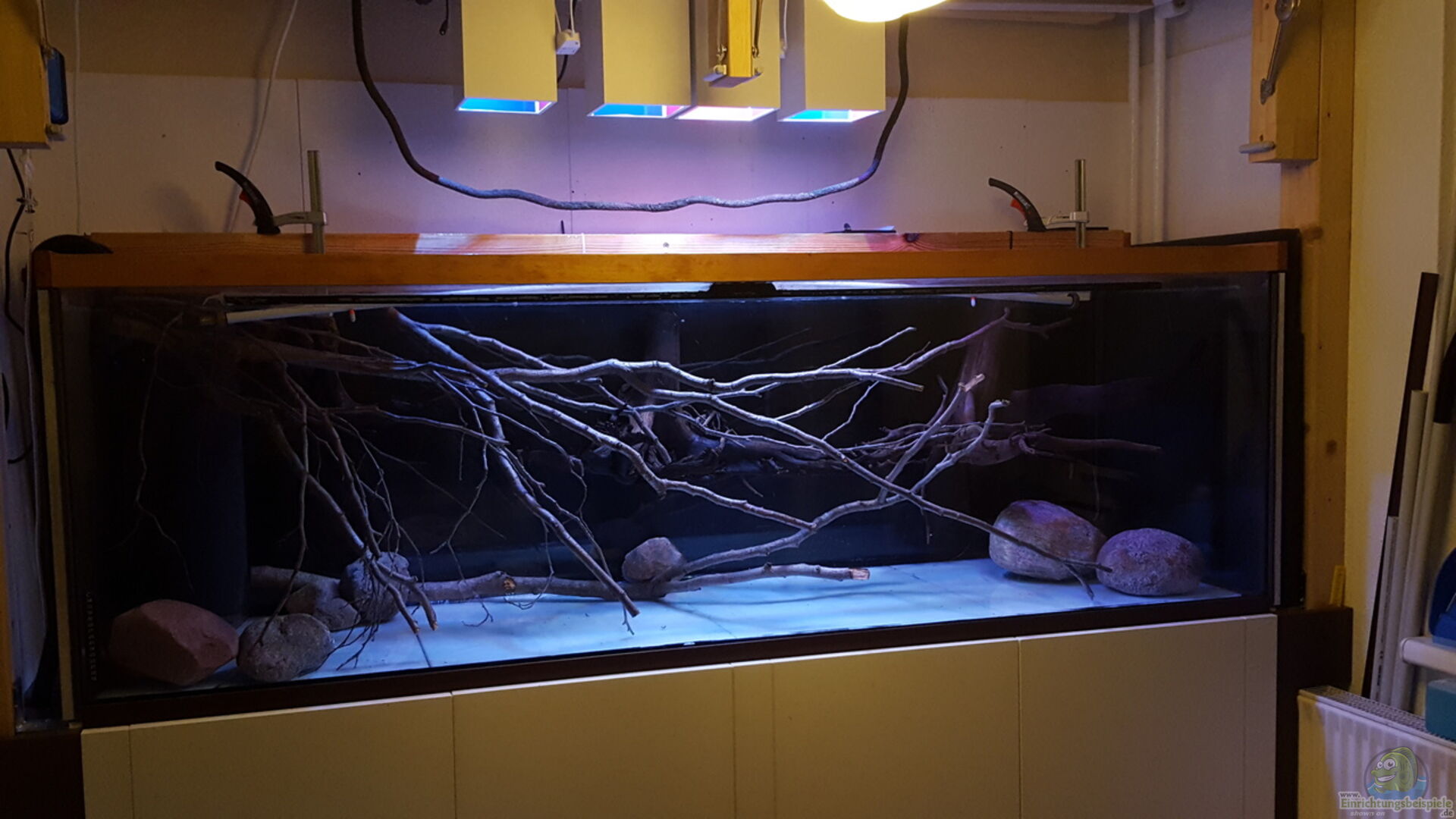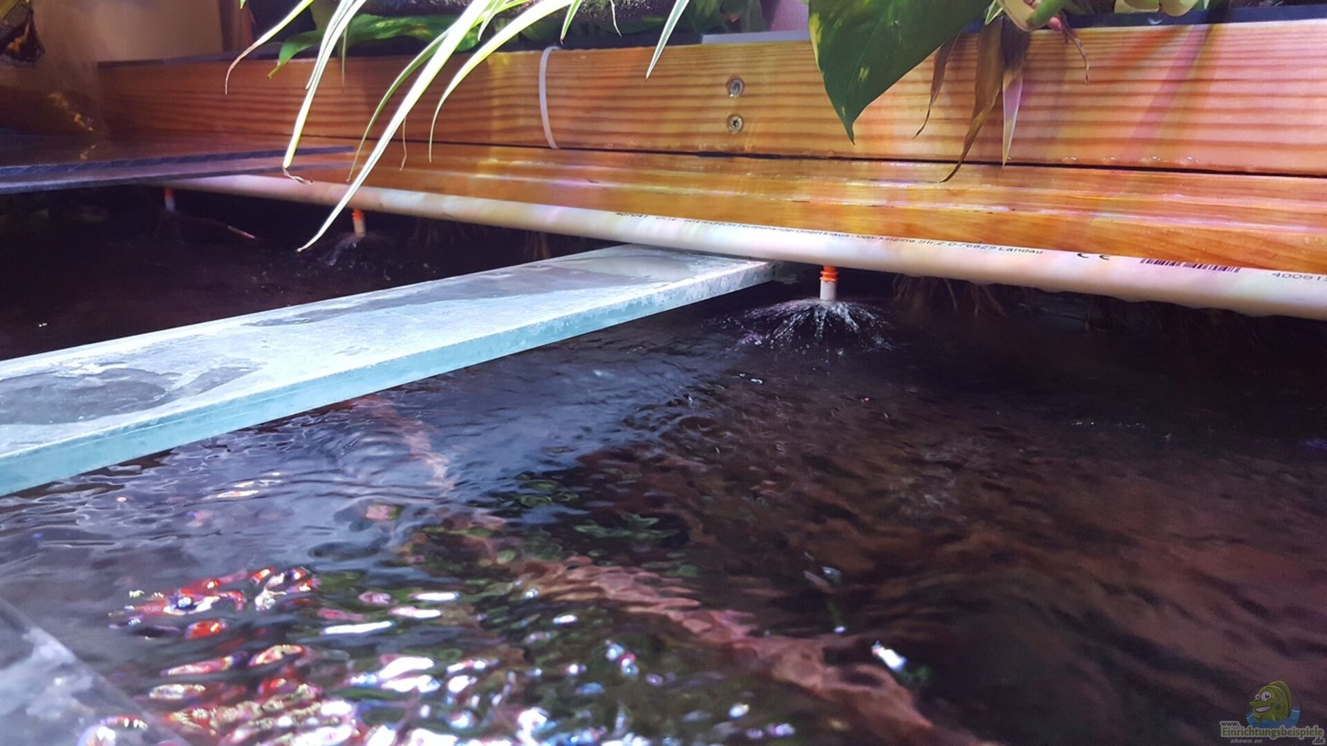 Efeutute über dem Becken. Dafür habe ich mir eine Konstruktion ausgedacht und angefertigt (siehe Bilder Aquarium). In diese Konstruktion kann ich mit Hilfe von einfachen Teich Pflanzen Körben die Efeututen über dem Becken platzieren, so dass nur die Wurzeln ins Wasser hängen. Diese haben den Vorteil das sie zusätzlich Nitrat aus dem Wasser ziehen und der andere positive Effekt ist das die Wurzeln sich ihren Weg durch die Unterwasser Landschaft suchen, was wirklich sehr sehr schön und sehr natürlich aussieht ????