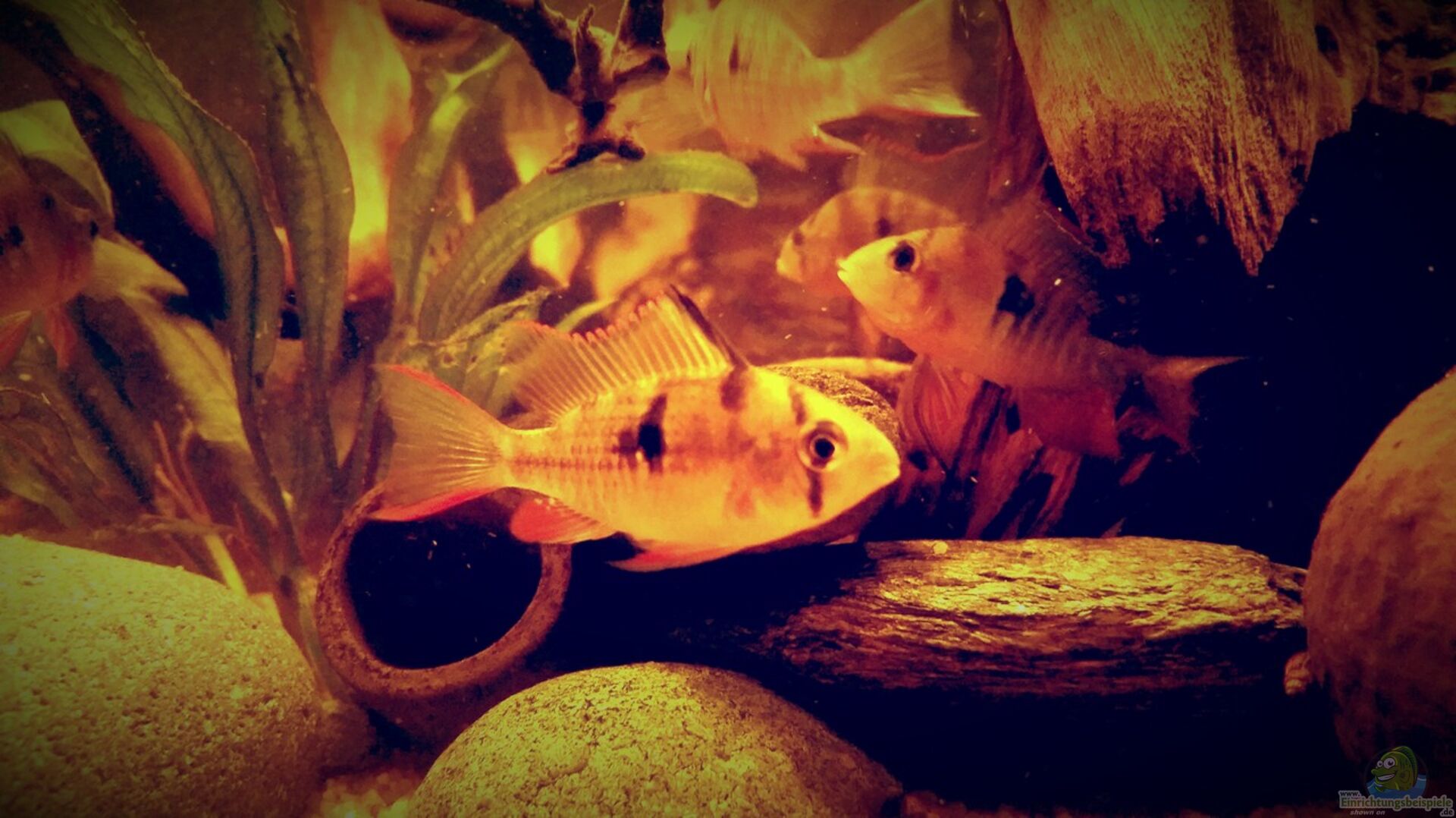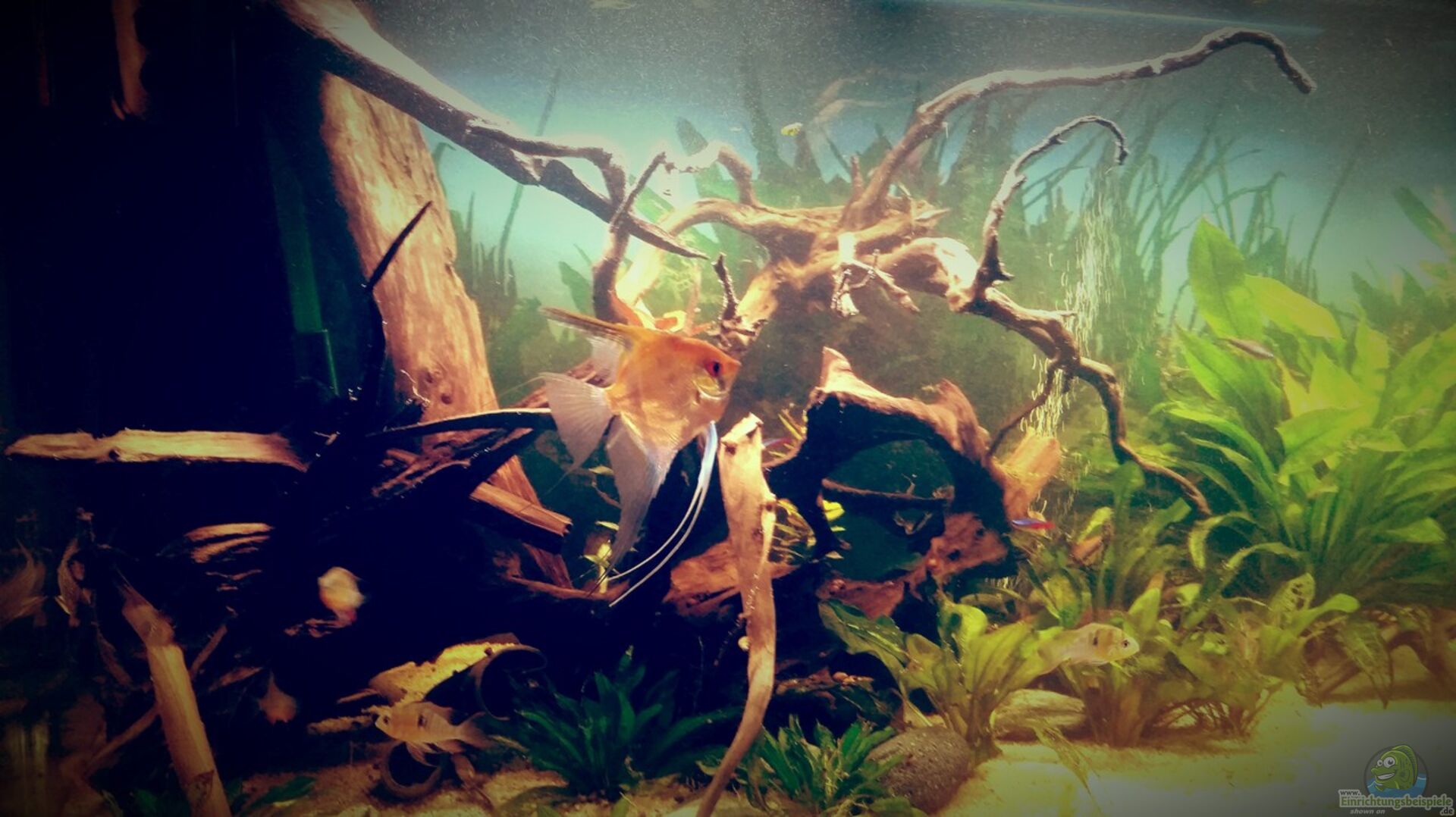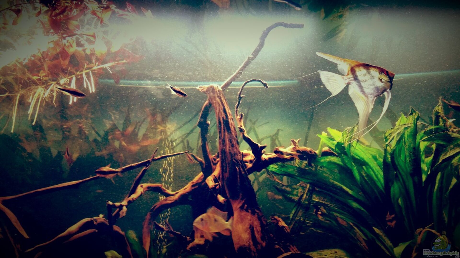 Dieses Becken soll das beschriebene Szenario zeigen. Einige Wurzel und ein dichtes Pflanzen aufkommen in dennen die Fische neue Nahrung und gute Versteckmöglichkeiten vor Räuber die im Amazonas leben finden.