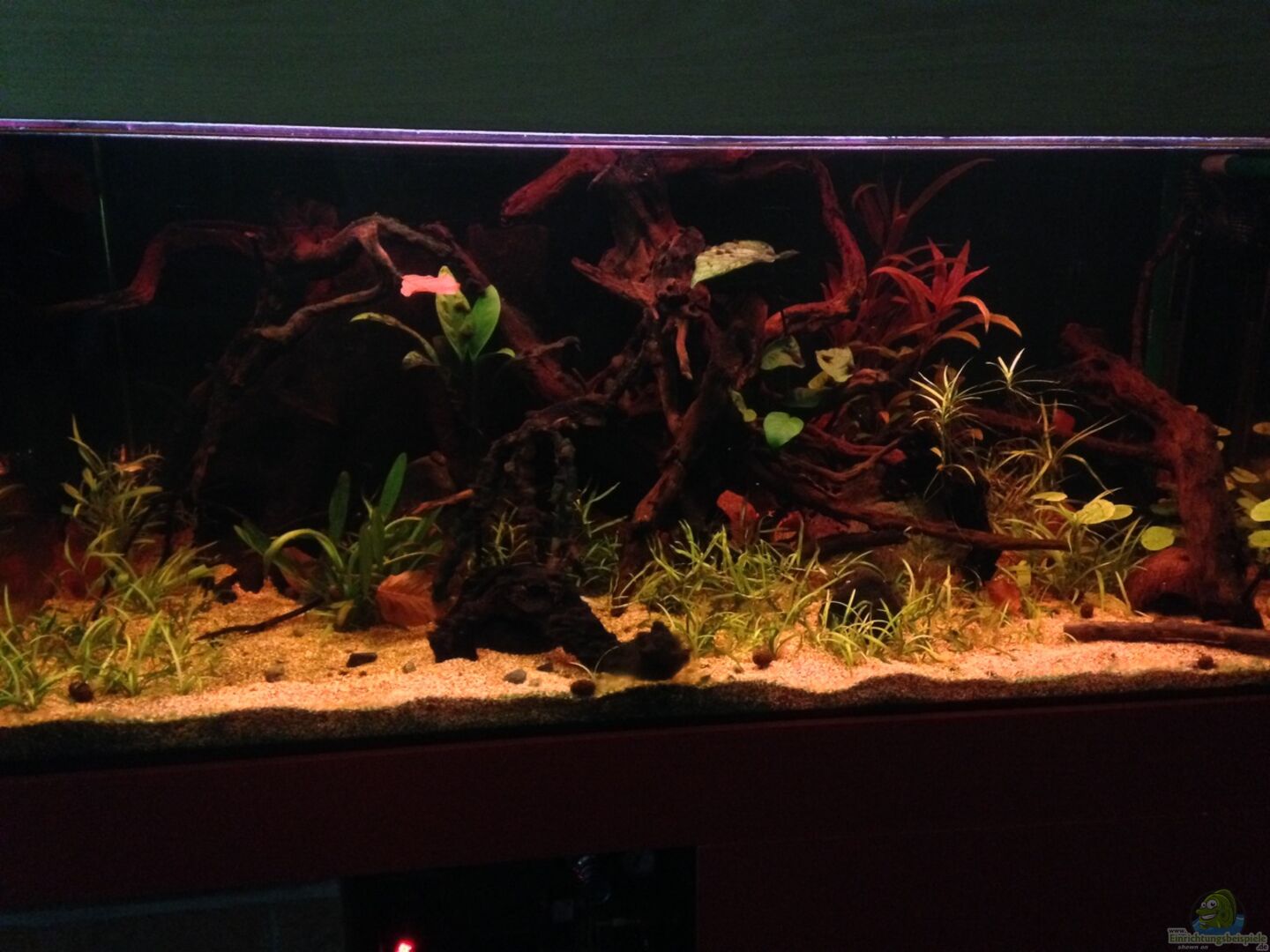 Der Unterschrank wurde selbst gebaut. Links und rechts zwei Porensteine, welche verklinkert wurden. Darauf befindet sich ein Stahlrahmen aus L-Profil, welche mit OSB-Platten verkleidet wurde. Die Blenden vom Stahlrahmen und zur Technik sind rot lackierte MDF-Platten zur Technik. Die Aquariumabdeckung ist von BioPlast (Farbe: Ahorn)