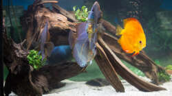 Dein Becken kommt Klasse rüber, vorallem weil du auf einen Schwarmfisch verzichtest. Rein optisch sehr natürlich-spartanisch. Hast auch wirklich hübsche Disken. Dennoch würden sie sich sicher über ein Vallisnerien-Eck freuen als Rückzugspunkt. Was ich persönlich auch Klasse fände, wäre eine Anbuias Mutterpflanze mittig ins Becken zu hängen.