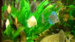 Düngung der Pflanzen: Die Düngung erfolgt hauptsächlich über das zugeführte CO2 und einen Volleisendünger von Asces-Aquaristik, wobei täglich ca. 3, 5 ml dosiert werden. Gelegentlich werden einige Laterit-Kugeln von Amtra in den Wurzelbereich der Pflanzen gegeben, oder Dennerle Deponit Düngekugeln und Dennerle E15 Eisendünger in Tablettenform. Die Pflanzen wachsen dadurch selbst bei den hohen Temperaturen von über 28 Grad sehr gut, die man halt für ein Diskusaquarium benötigt.