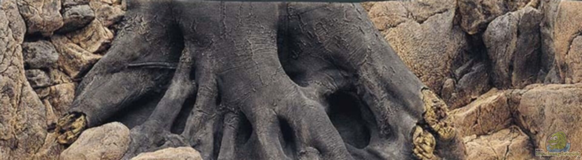 Aquarienrückwand von Back to Nature "Amazonas 200 x 60", die Rückwand wurde ein wenig oben eingekürzt, um näher an die hintere Aquarienwand zu kommen und so mehr Schwimmraum zu erreichen. Die Rückwand wurde komplett mit schwarzem Aquariensilikon im Aquarium verklebt / eingedichtet, hinter der Rückwand wurde ausserdem ein Bioinnenfilter eingerichtet.