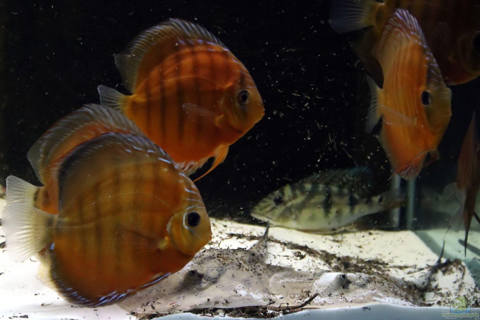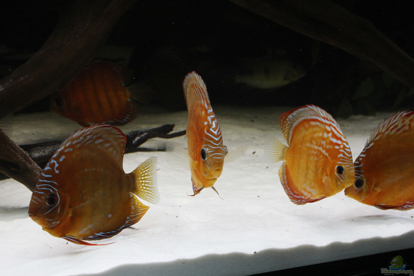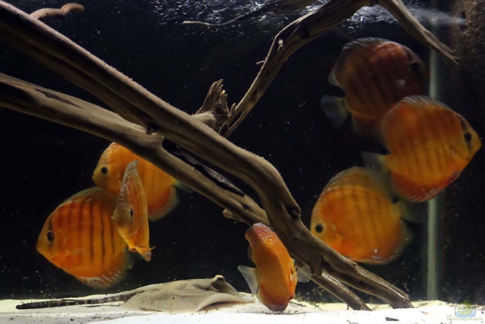 Da mein Versuch die Rochen mit einer Pflanzenzange zu füttern leider auch keinen Erfolg bei der Füttern gebracht hat, habe ich lange nachgedacht und bin zu einer denke ich sehr guten Lösung gekommen. Das zuerst abgebaute alte 390L Aquarium wurde nachdem es nicht vernünftig verkauft werden konnte im Wohnzimmer wieder in Betrieb genommen, hier unter "Wohnzimmer Ocinoco" zu finden. Bis auf die zwei Satanoperca Daemon ist der restliche Besatz, der super harmoniert umgezogen, sodass im gro??en Becken erst einmal wieder Platz und vor allem Ruhe für meine zwei Hystrix war. Als ich auf der Suche nach einem ruhigeren Besatz für das Becken war, bin ich auf Diskusfische gesto??en, habe mich einige Zeit informiert und mich letztendlich für 8 Nhamunda/Alenquer Wildfangnachzuchten entschieden. Wildfangdiskus kamen für mich als Anfänger noch nicht in Frage und da ich die natürliche Farbgebung sehr mag, bin ich sehr glücklich mit meinen Nachzuchten.