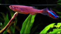 ´Aus dem Mekongbecken im Nordosten Thailands und der daran grenzenden Luang Prabang Provinz in Laos stammt der Rosenbärbling, Danio roseus Fang & Kottelat, 2000. Aquarium Glaser importierte diese sehr hübschen Fischchen aus Nord-Thailand. Die Art ist nahe verwandt mit dem bekannten, ursprünglich aus Myanmar beschriebenen Schillerbärbling, Danio albolineatus (Blyth, 1860), wirkt im Vergleich zu jener Art aber gedrungener und ist seitlich weniger stark zusammengedrückt. Im Vergleich zu den Weibchen bleiben die Männchen des Rosenbärblings kleiner und schlanker, gleichzeitig sind sie aber farbenprächtiger. Ihre Bauchregion einschlie??lich der Bauch- und Afterflossen wird bei Wohlbefinden intensiv rot. Auch D. roseus ist mit etwa 6 cm Länge ausgewachsen.´ (Quelle: aqua-terra-net, Neuimporte).