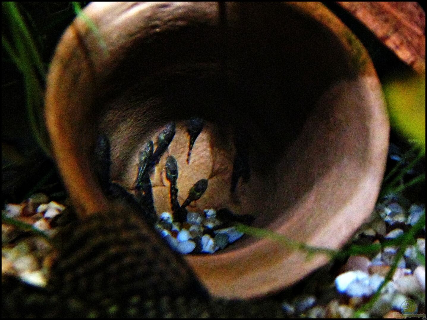 Die Tiere wurden beim Händler in einem 5l Becken gehalten und ich habe mir diese bei jedem Besuch im Laden angeschaut. Schlie??lich habe ich mir doch ein Herz gefasst und die 8 Kerle mitgenommen. Diese wurden dann in mein anderes Becken (Asienbecken) eingesetzt. Leider hat dies nicht funktioniert, da die Art sehr lebhaft ist, was im Zoohandel noch nicht so deutlich wurde. Auf jeden Fall hat I. werneri bei der Fütterung nichts mehr abbekommen und Garnelen waren auch nicht mehr im Becken zu sehen. Darum die Umsiedelung ins Amerika-Becken.