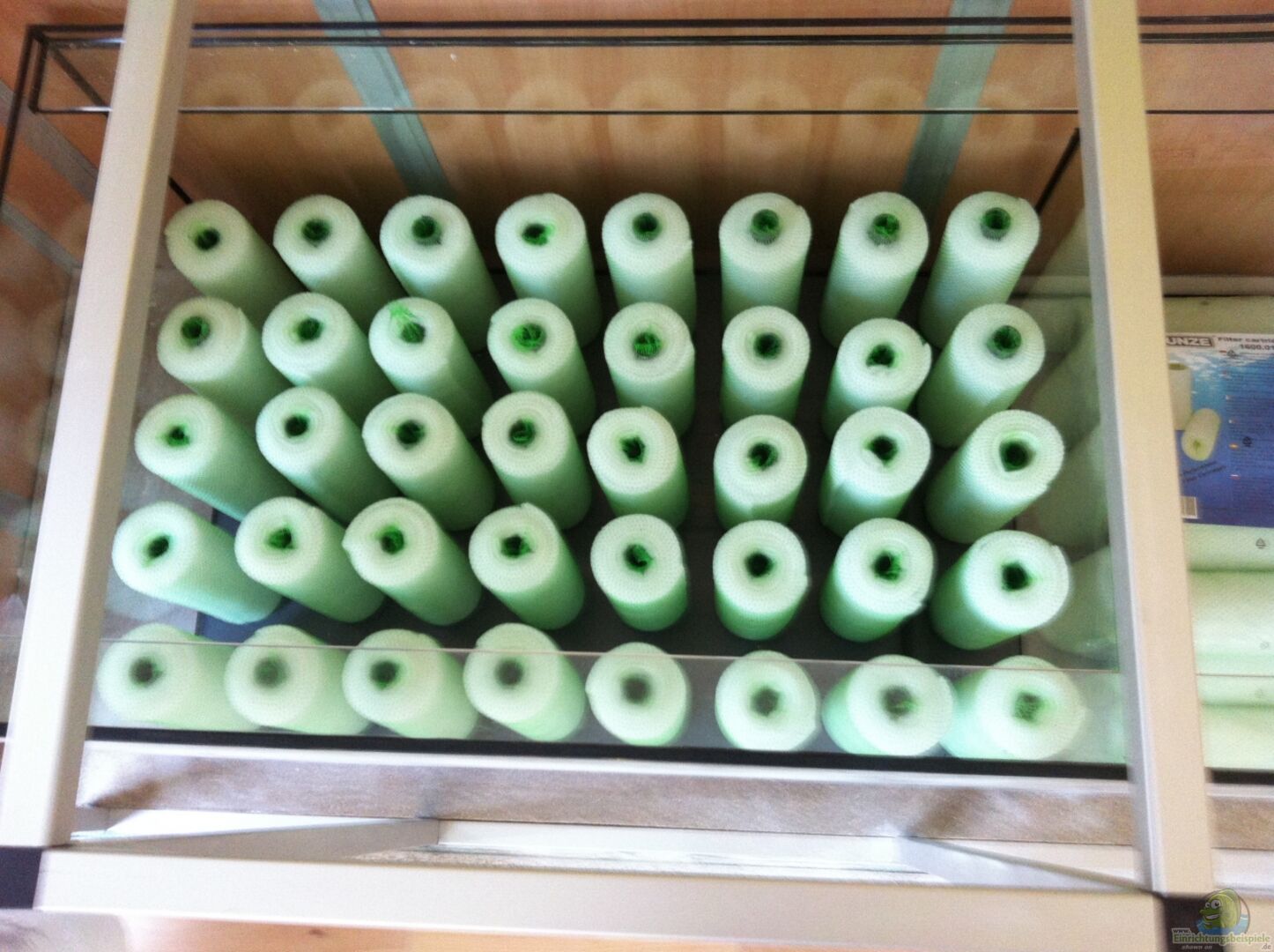 -Filterbecken 120x60x50 360 liter mit 40 Watte Filterpatronen von Tunze. Die Watte Patronen stecken auf geschlitzten Rohren die wiederum in einer gro??en PVC Platte stecken! Das ganze Wasser muss also durch Watte . Die Pummen sind 2x Aqua Medic Ocean Runner 3500 zusammen mit einer max Förderleistung von ca 6000 L/h die aber auch sepperat über einen Kugelhagel an der Druckseite gedrosselt weden können.