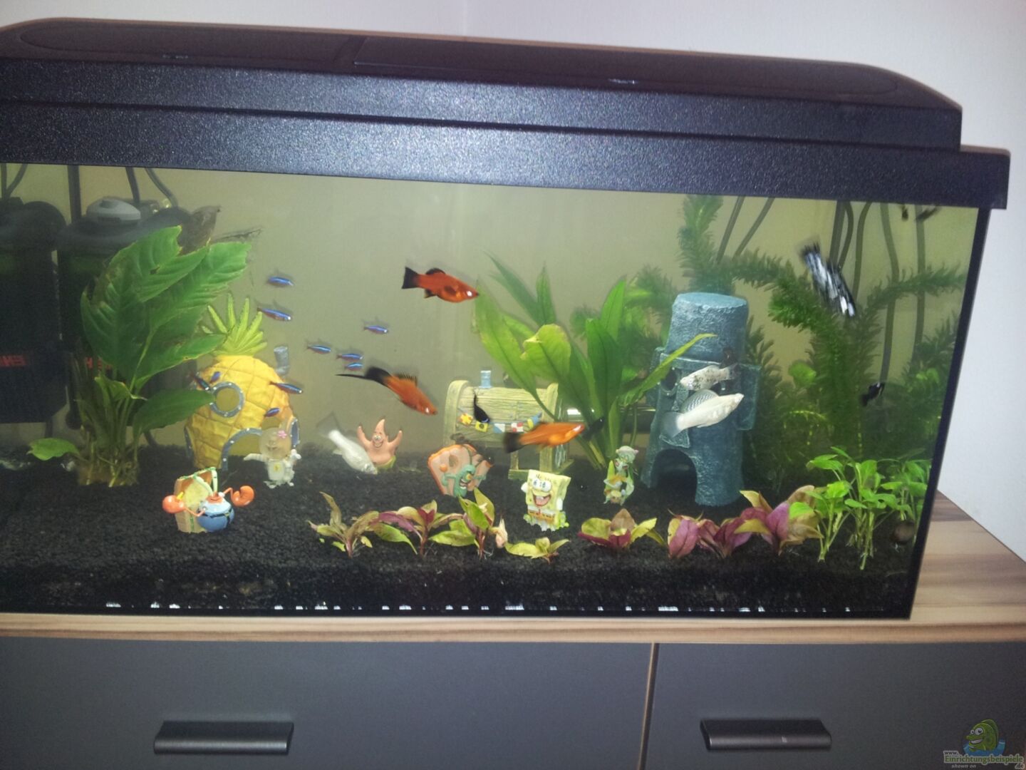 Becken zum Teil (von au?en) `dreckig` (aber bei drei Kindern, deren liebste Beschäftigung es ist, mit der Nase am Beckenglas zu hängen und den Fischen Namen zu geben... :-) )...