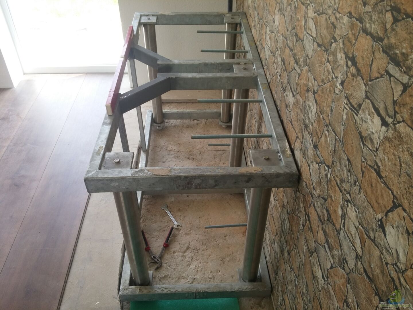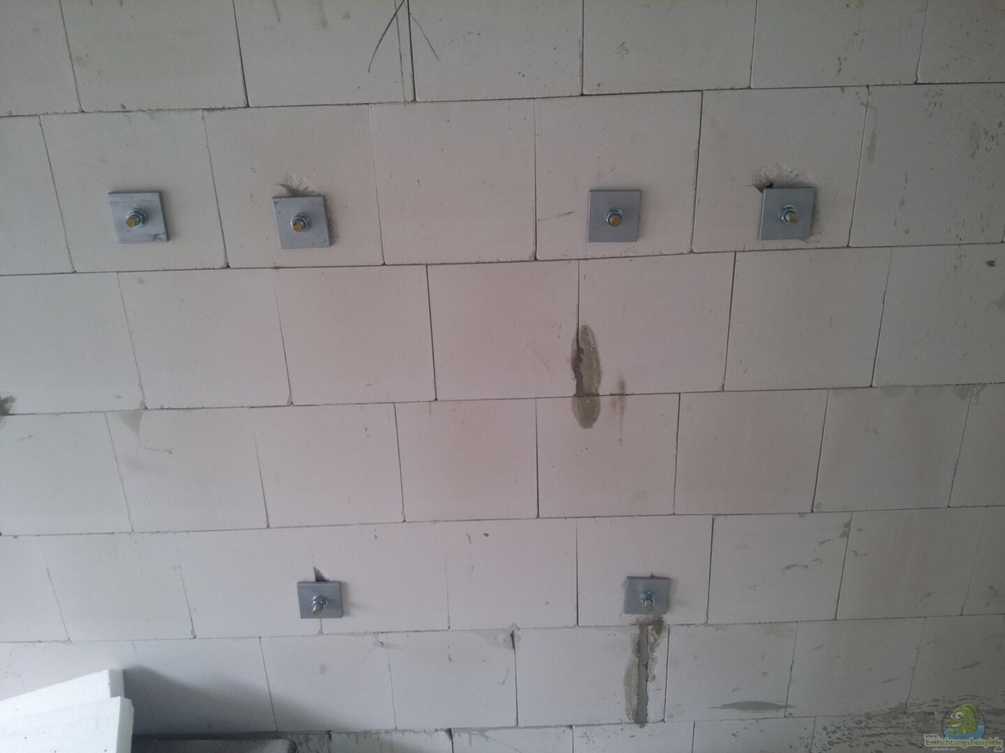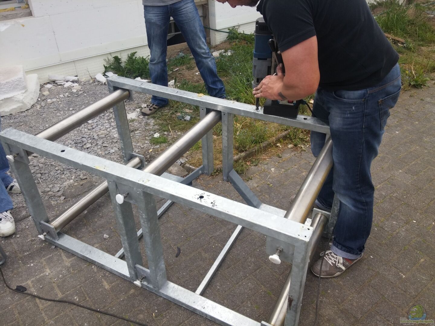 Das Becken steht auf einem Stahluntergestell mit einer Breite von 150cm und einer Tiefe von 70cm. Das Gestell ist zur Gewichtsentlastung des doch recht dünnen Betonfu??bodens mit 6 16mm starken Gewindestangen an der Wand befestigt. Die Gewindestangen sind in der dahinter liegenden Garage mit 12x12cm gro??en Stahlplatte verschraubt. Gesamtstärke der Au??enwand mir angemauerter Garage beträgt ca. 70cm.