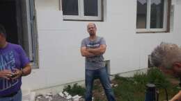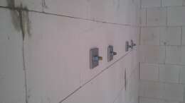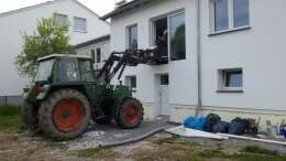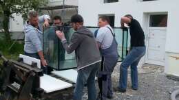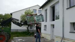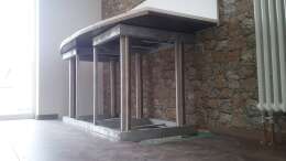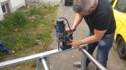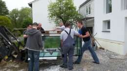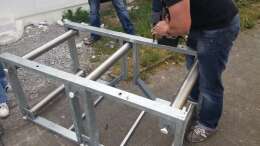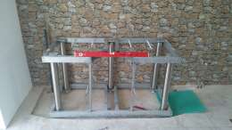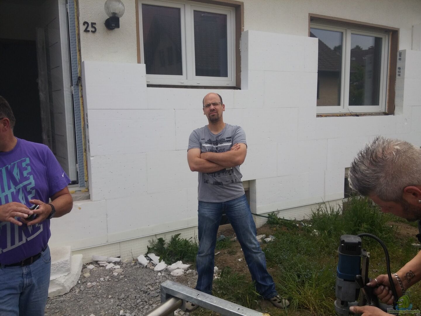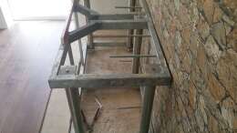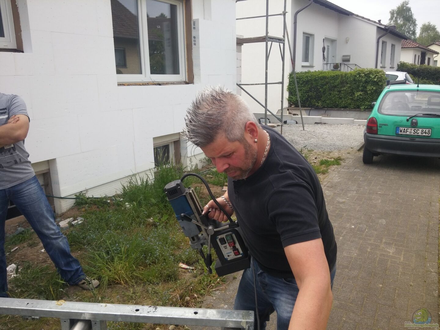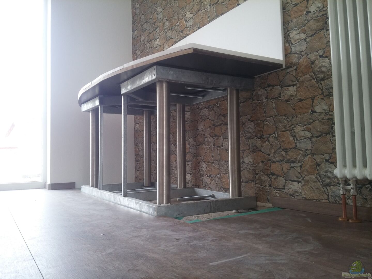 Das Becken steht auf einem Stahluntergestell mit einer Breite von 150cm und einer Tiefe von 70cm. Das Gestell ist zur Gewichtsentlastung des doch recht dünnen Betonfu??bodens mit 6 16mm starken Gewindestangen an der Wand befestigt. Die Gewindestangen sind in der dahinter liegenden Garage mit 12x12cm gro??en Stahlplatte verschraubt. Gesamtstärke der Au??enwand mir angemauerter Garage beträgt ca. 70cm.